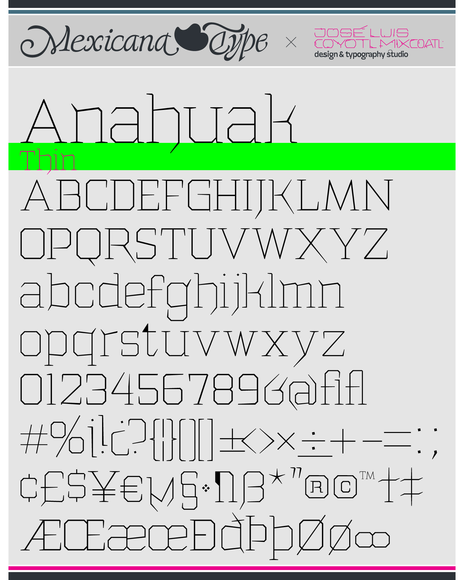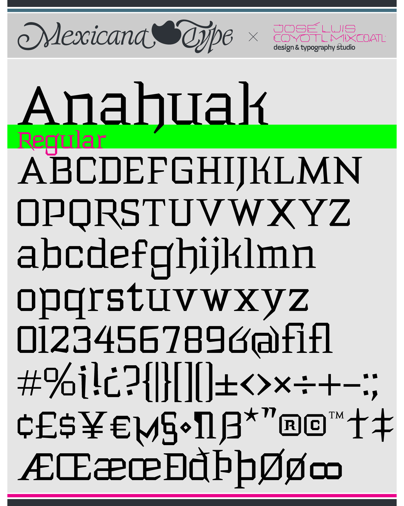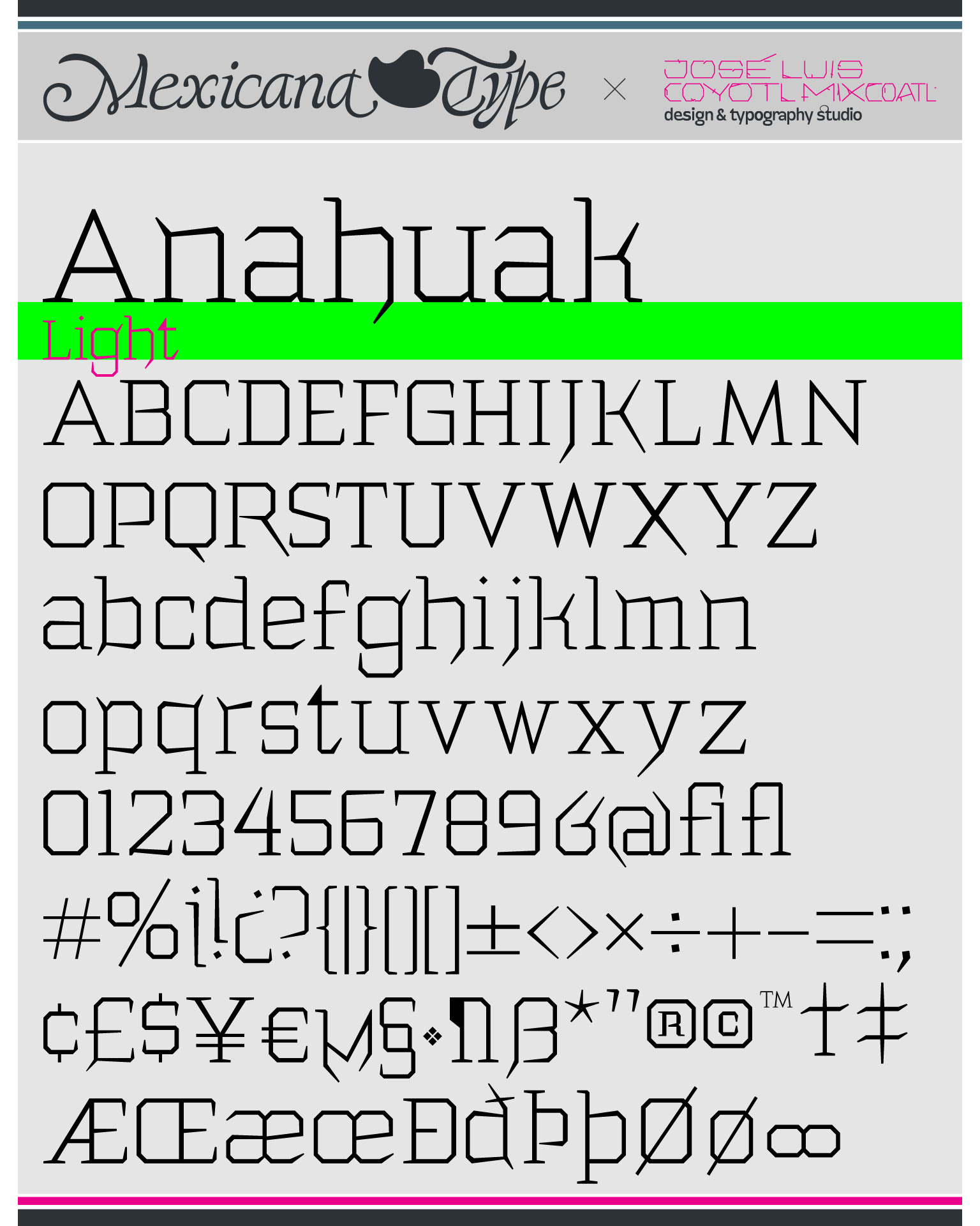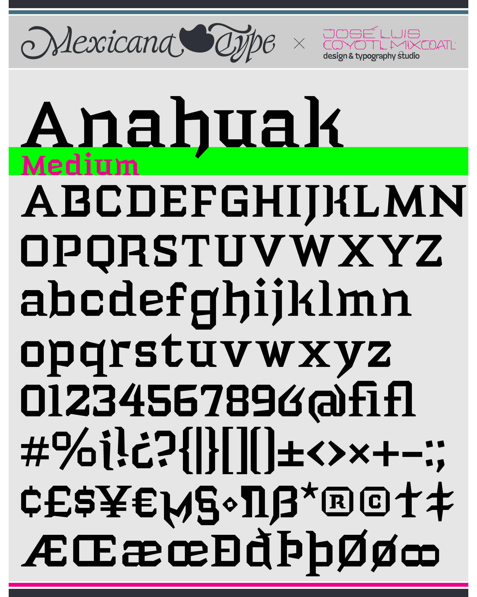 La estructura de MxT Anahuak fue desarrollada a partir de arquitectura prehispánica, particularmente basada en los trazos modulares de muros y pirámides del valle del Anáhuac. Sus líneas son de rasgos sólidos y firmes, con una estructura poligonal en todos sus trazos con rasgos finos pero también elegantes fueron complementados con rasgos de letra negra y serifs firmes y gruesos en la forma de basamentos de la arquitectura precolombina y colonial, con un rango amplio de pesos tipográficos lo cual la hace una familia muy versátil para títulos especialmente.