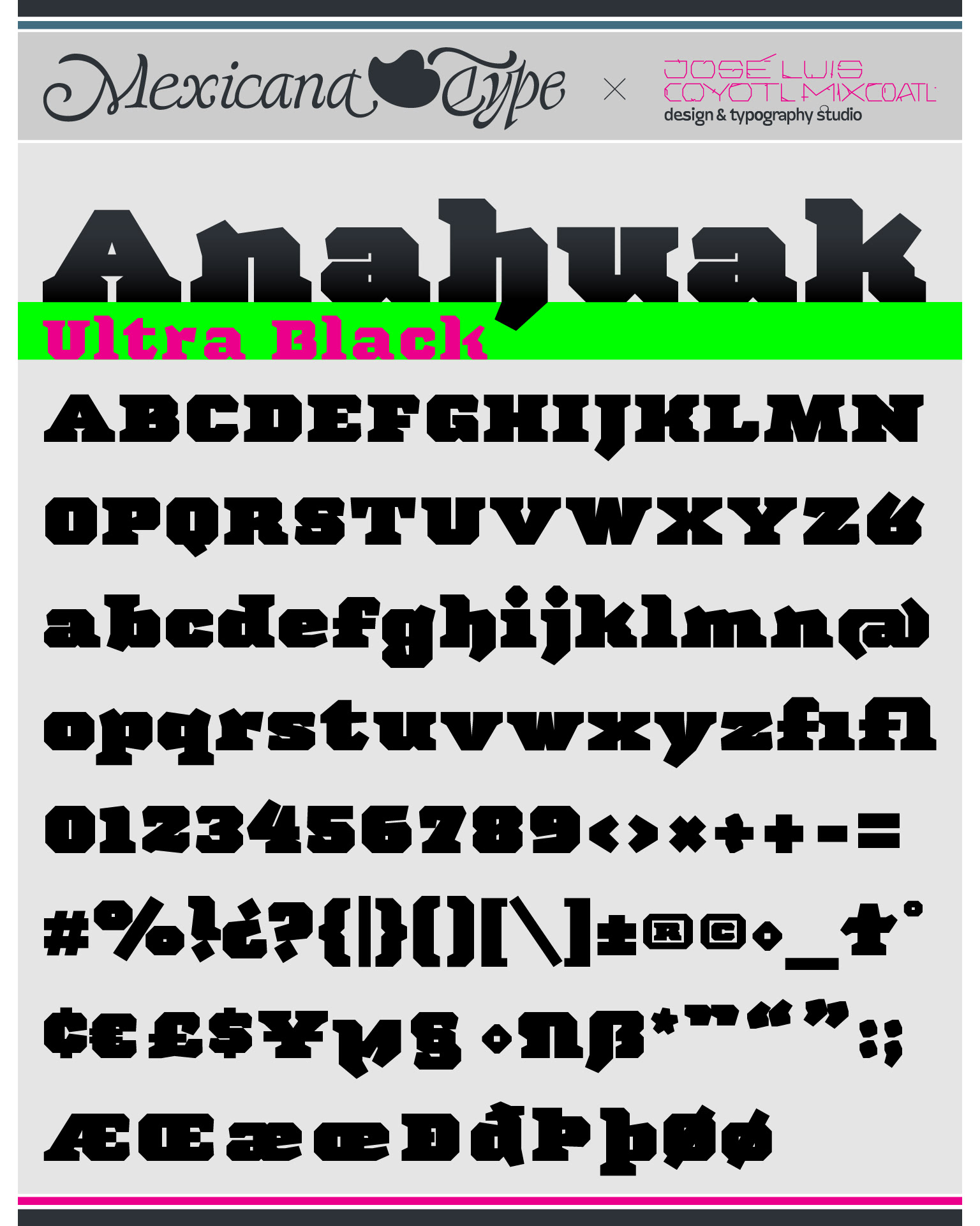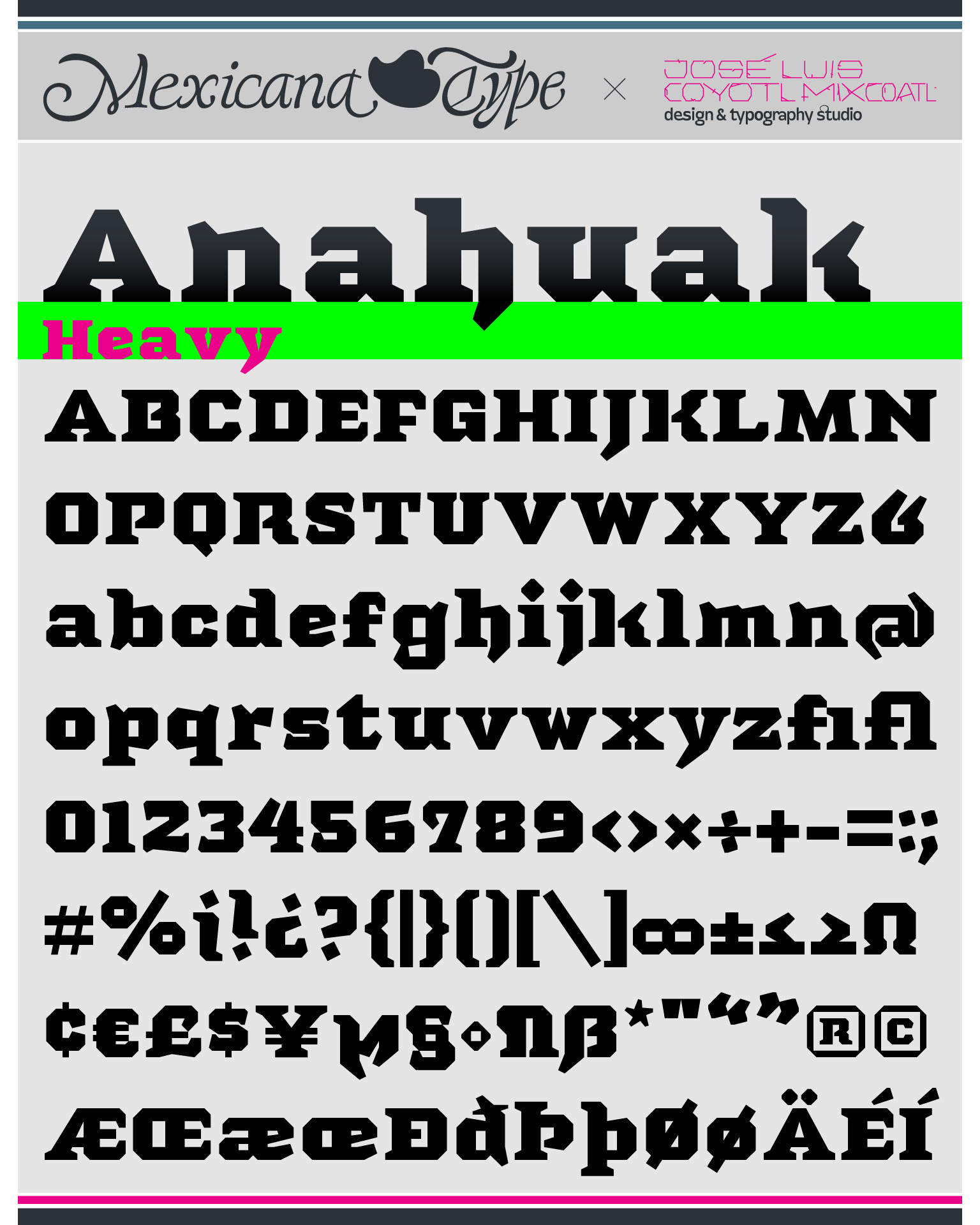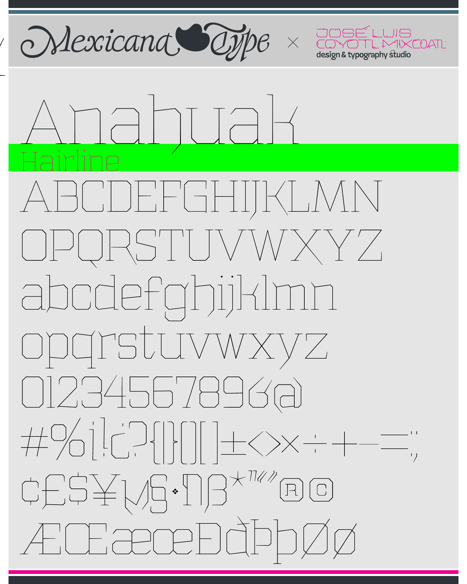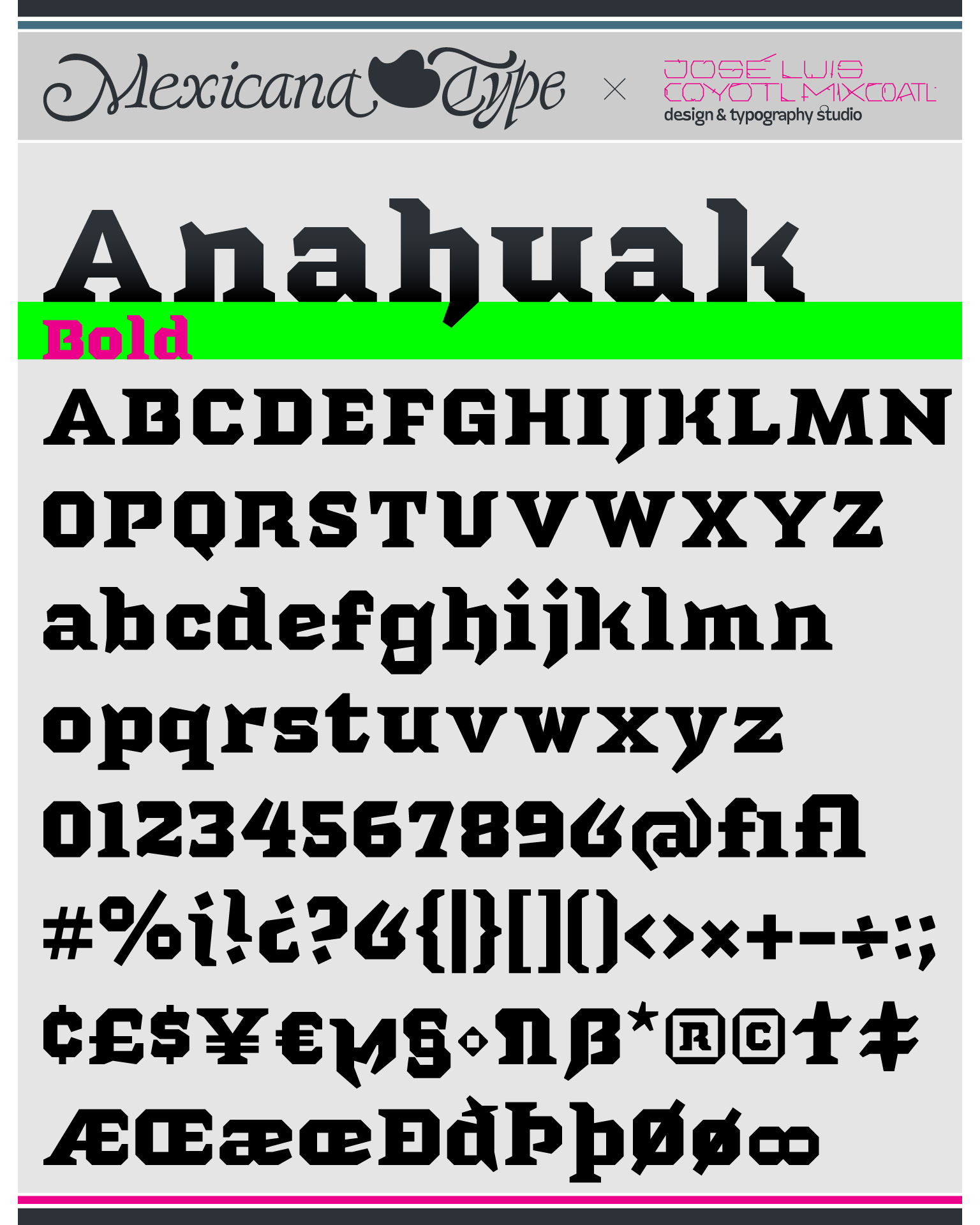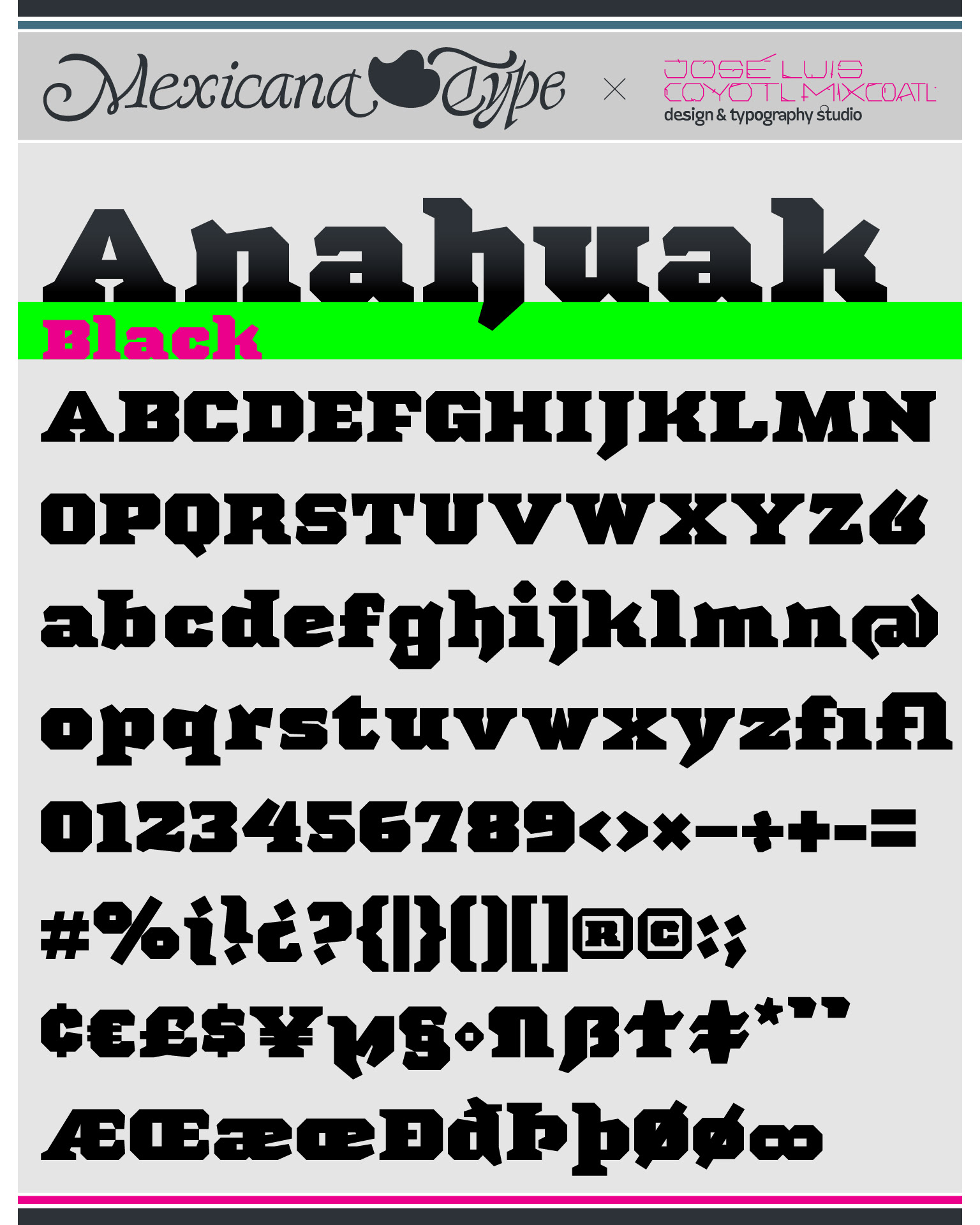 La estructura de MxT Anahuak fue desarrollada a partir de arquitectura prehispánica, particularmente basada en los trazos modulares de muros y pirámides del valle del Anáhuac. Sus líneas son de rasgos sólidos y firmes, con una estructura poligonal en todos sus trazos con rasgos finos pero también elegantes fueron complementados con rasgos de letra negra y serifs firmes y gruesos en la forma de basamentos de la arquitectura precolombina y colonial, con un rango amplio de pesos tipográficos lo cual la hace una familia muy versátil para títulos especialmente.