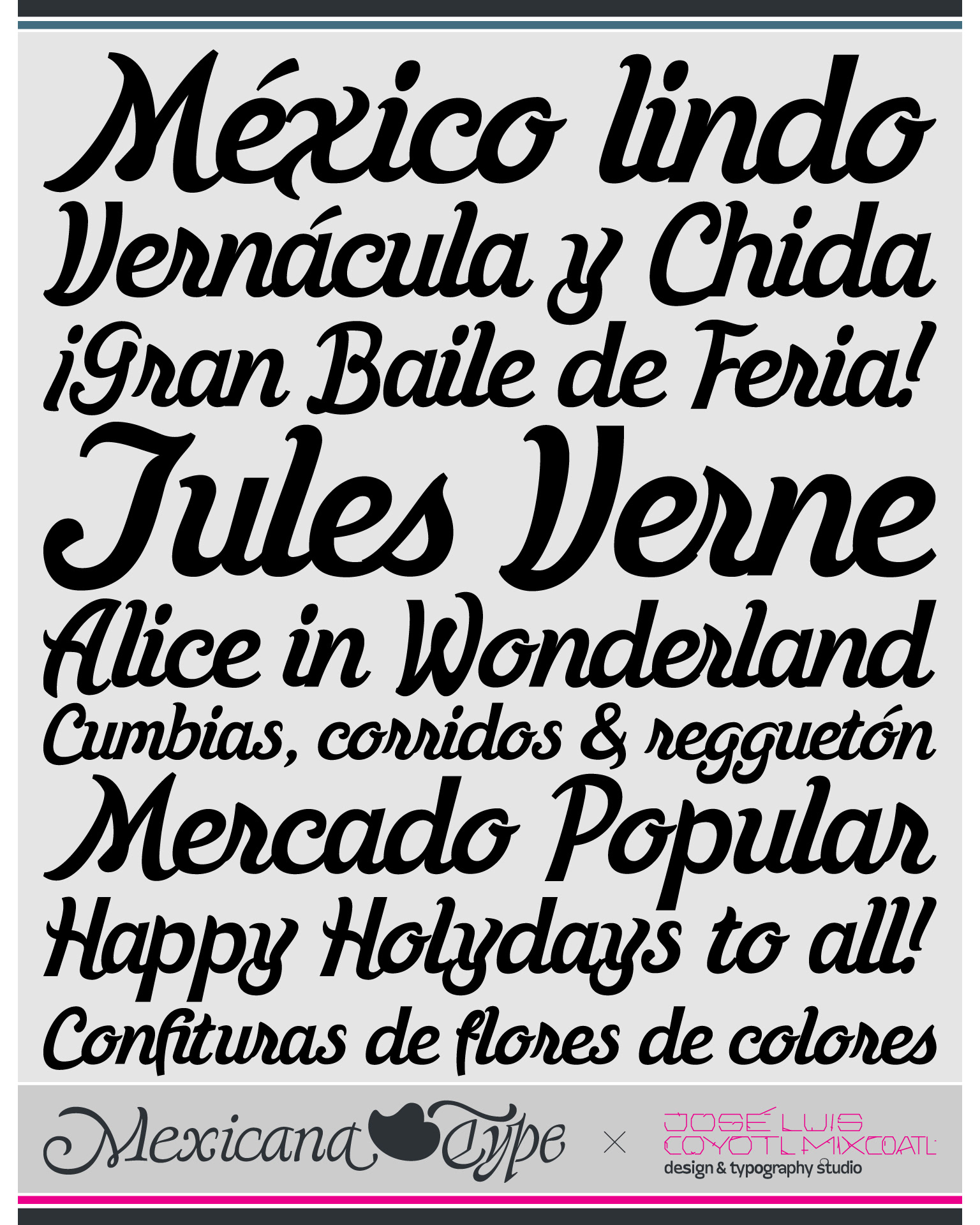 Mxt Central es una fuente que viene de el desarrollo con un perfil mucho más limpio y estético de MxT Santanera, que tienen la base formal y conceptual de letras vernáculas mexicanas, de la letra rotulada pintada a mano principalmente en entornos de cultura popular como mercados, la Centrales de Abasto, camiones de antaño, pero ahora con un sentido un poco más dinámico y estilizado, desarrollado con un estilo script, lo que en conjunto le da un aspecto asimétrico y contrastado en sus formas, con unas mayúsculas/altas que tienen una linea base que baja un poco para darle un cuerpo a los textos un tanto más dinámicos. Con un diseño completamente dinámico que no abre mucho espacio a los trazos rectos, sus curvas la definen y generan una amplia gama de contraformas y contrastes juguetones, con remates de curvas y extensiones muy diversas sin perder cierto sentido experimental en sus formas y en su conjunto en la mancha tipográfica, haciendo de esta tipografía una display con muchas posibilidades en su uso y aplicación.