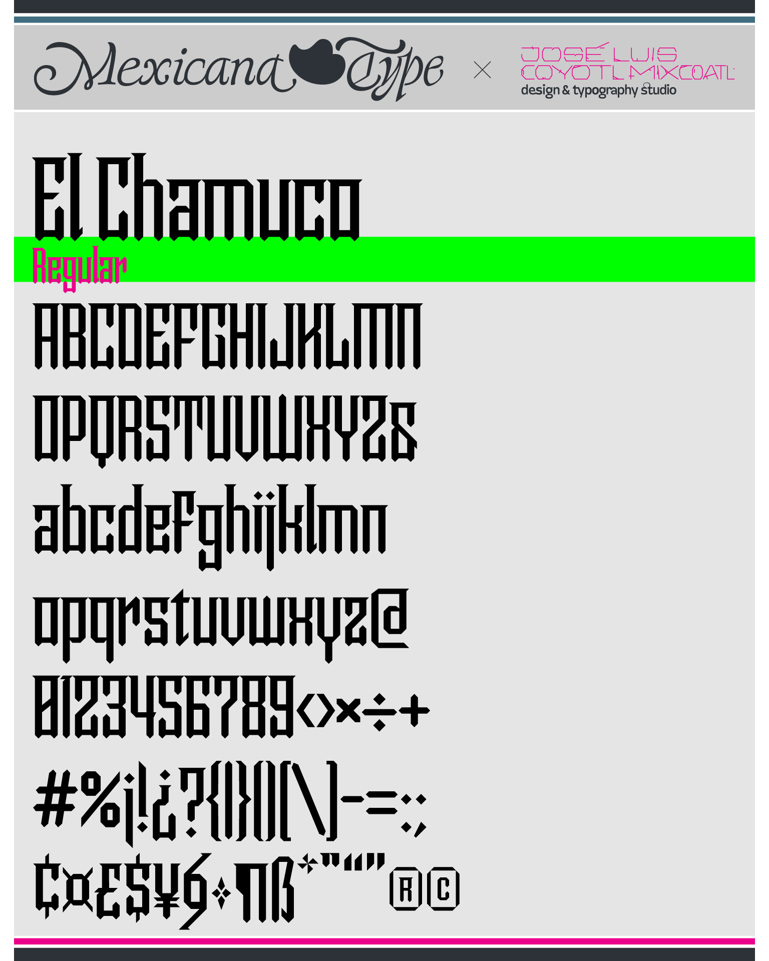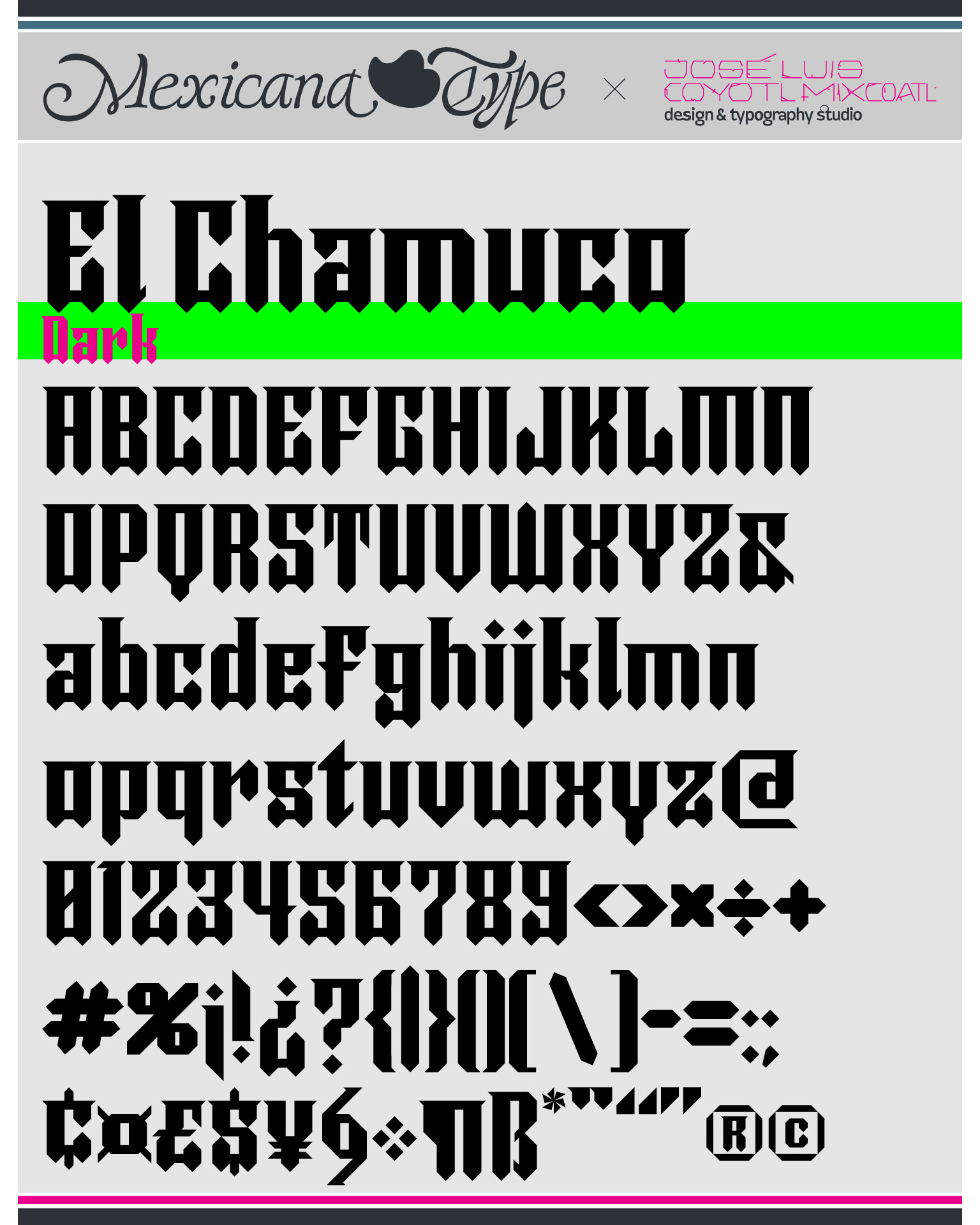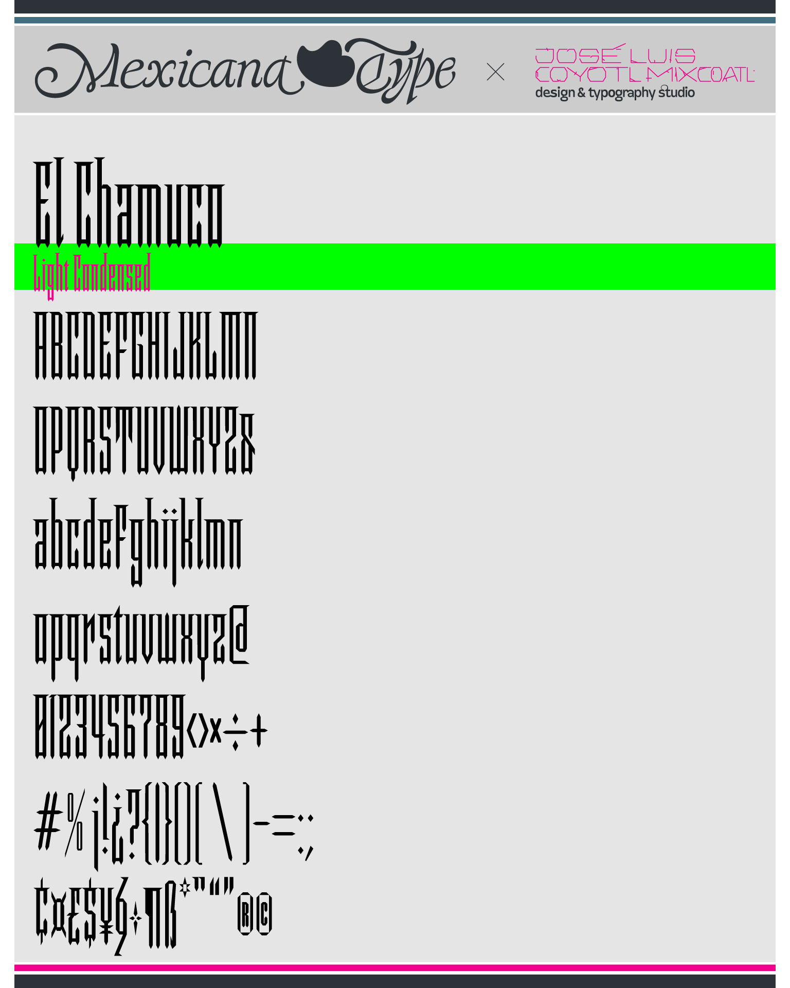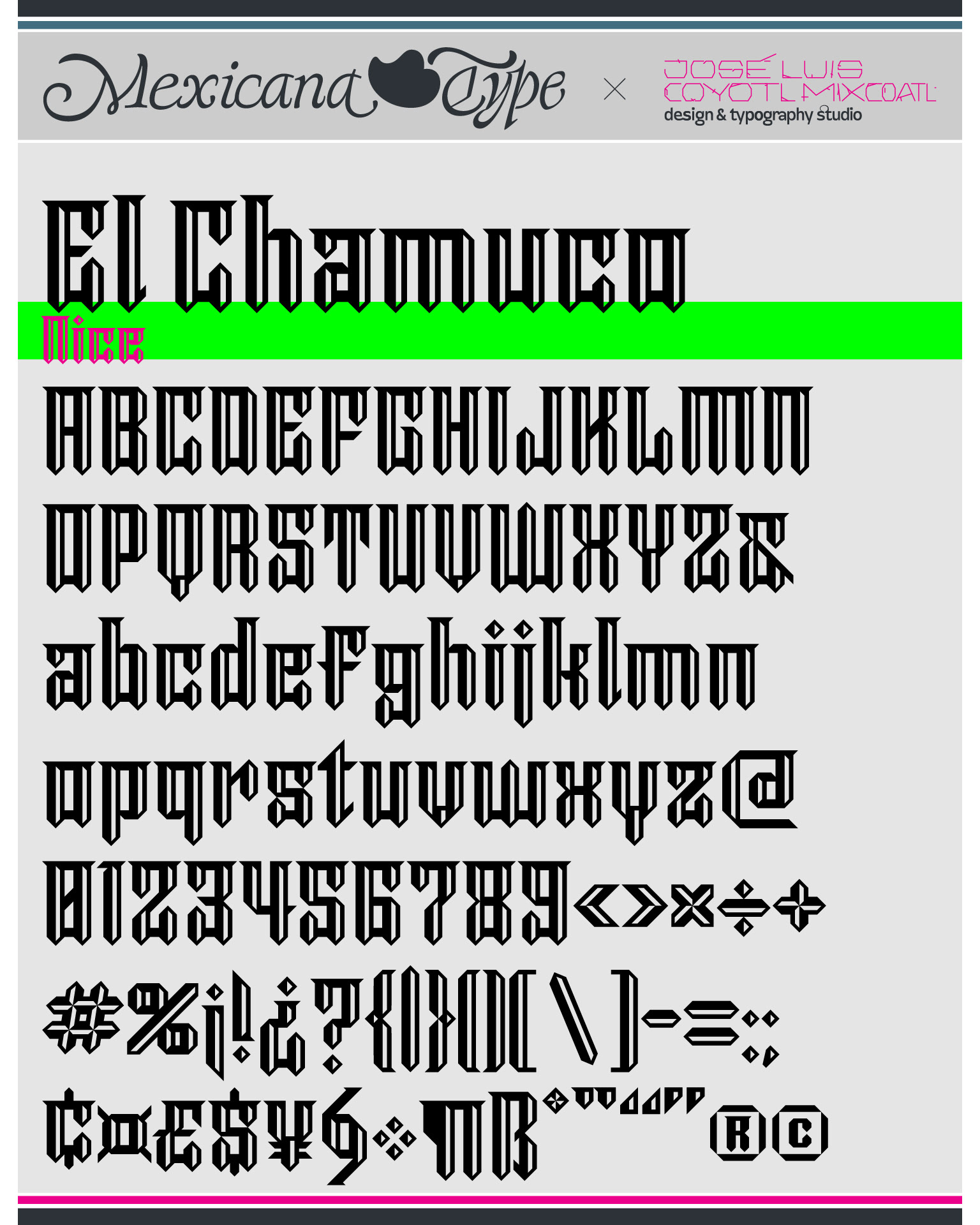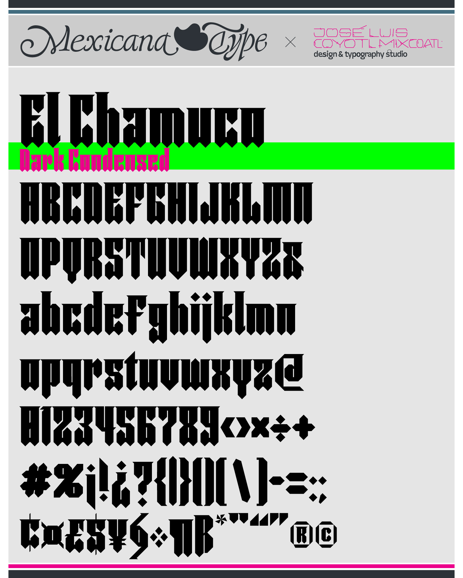 MxT El Chamuco es una tipografía, que es prácticamente la segunda que diseñé, que data de alrededor de 1999 con cuatro pesos, aunque fue ampliada en el 2024 a 13 pesos y variantes con un estilo que remite a algunos trazos, cuerpo y estructura de gótica 'Textur', pero al mismo tiempo con un espíritu modular de letras pintadas a mano y gráfica popular mexicana con un sentido mucho más moderno y contemporáneo. Su diseño permite un flujo de texto de formas contínuas en sus remates y terminaciones, aludiendo a los cuernos, patas y cola de El Chamuco, personaje muy arraigado en la cultura popular mexicana, y de la que a manera de sátira se recrea en cada una de sus variantes, desde la mas extendida hasta las más condensadas en sus diferentes pesos y, aunque es una tipografía para títulos, también tiene variantes estilísticas aún más display que le dan un enfoque muy singular y con las posibilidades de tener combinaciones muy interesantes en sus bloques de textos, permitiendo eficiencia de espacio en todas sus variantes pero también en la riqueza de sus formas.