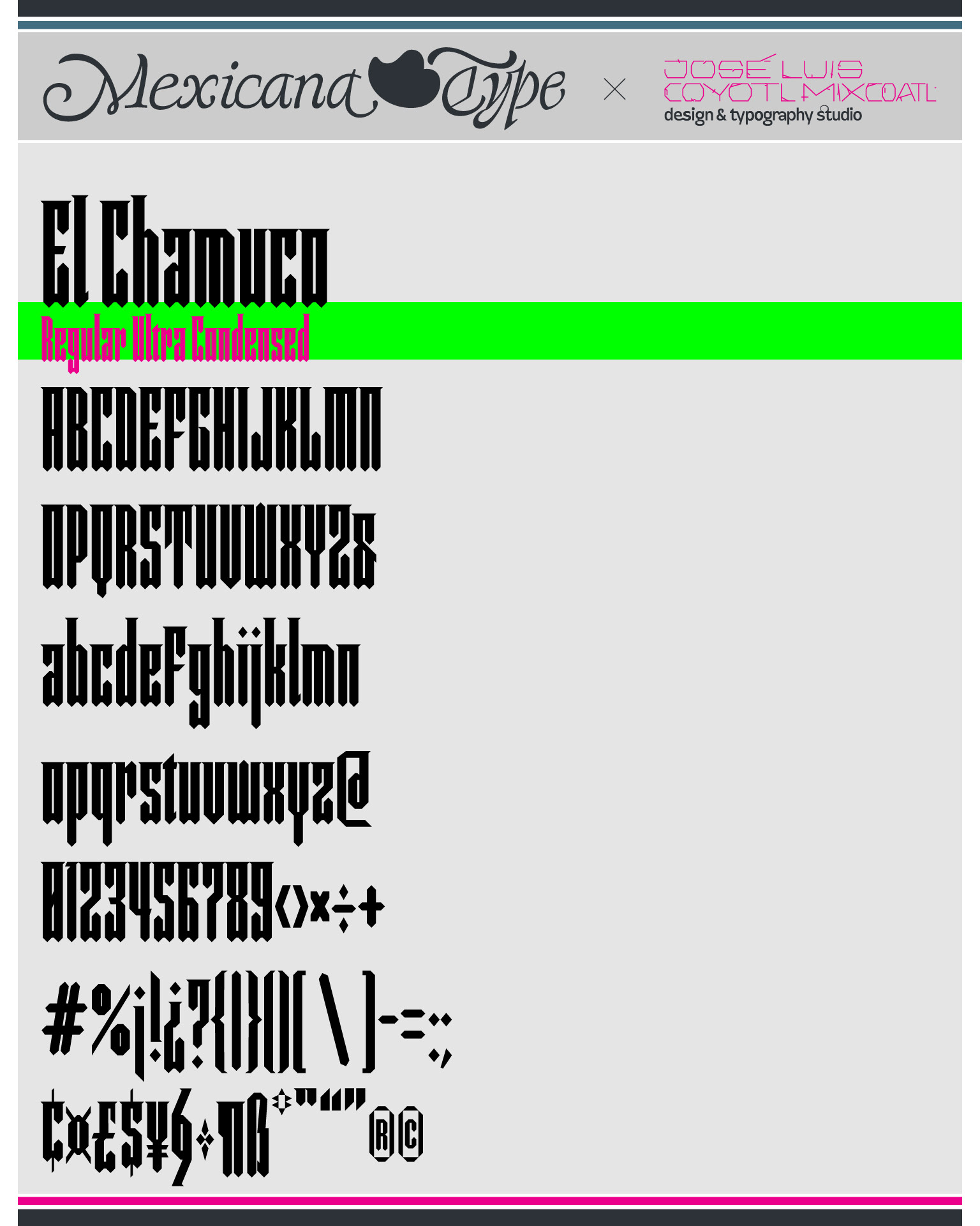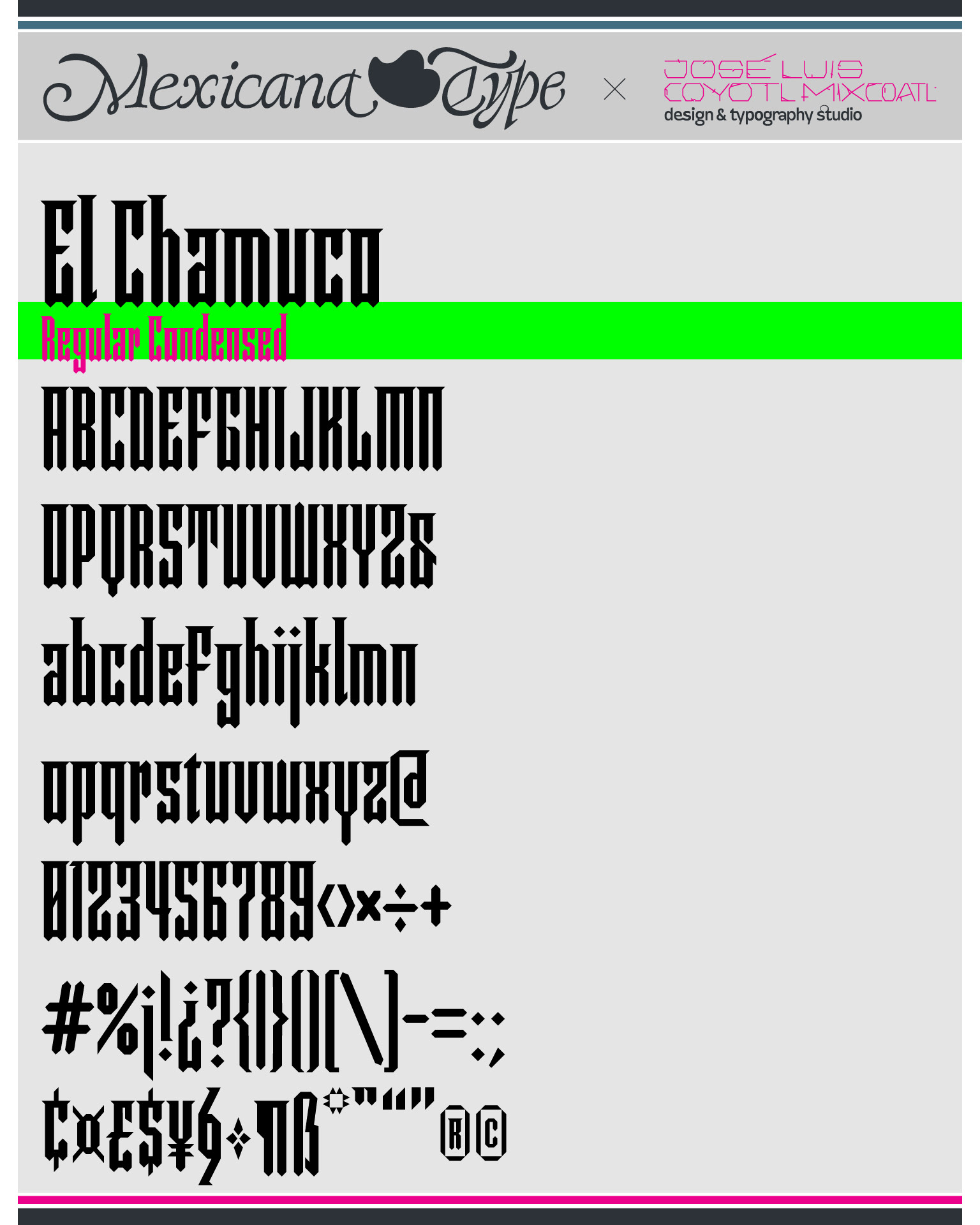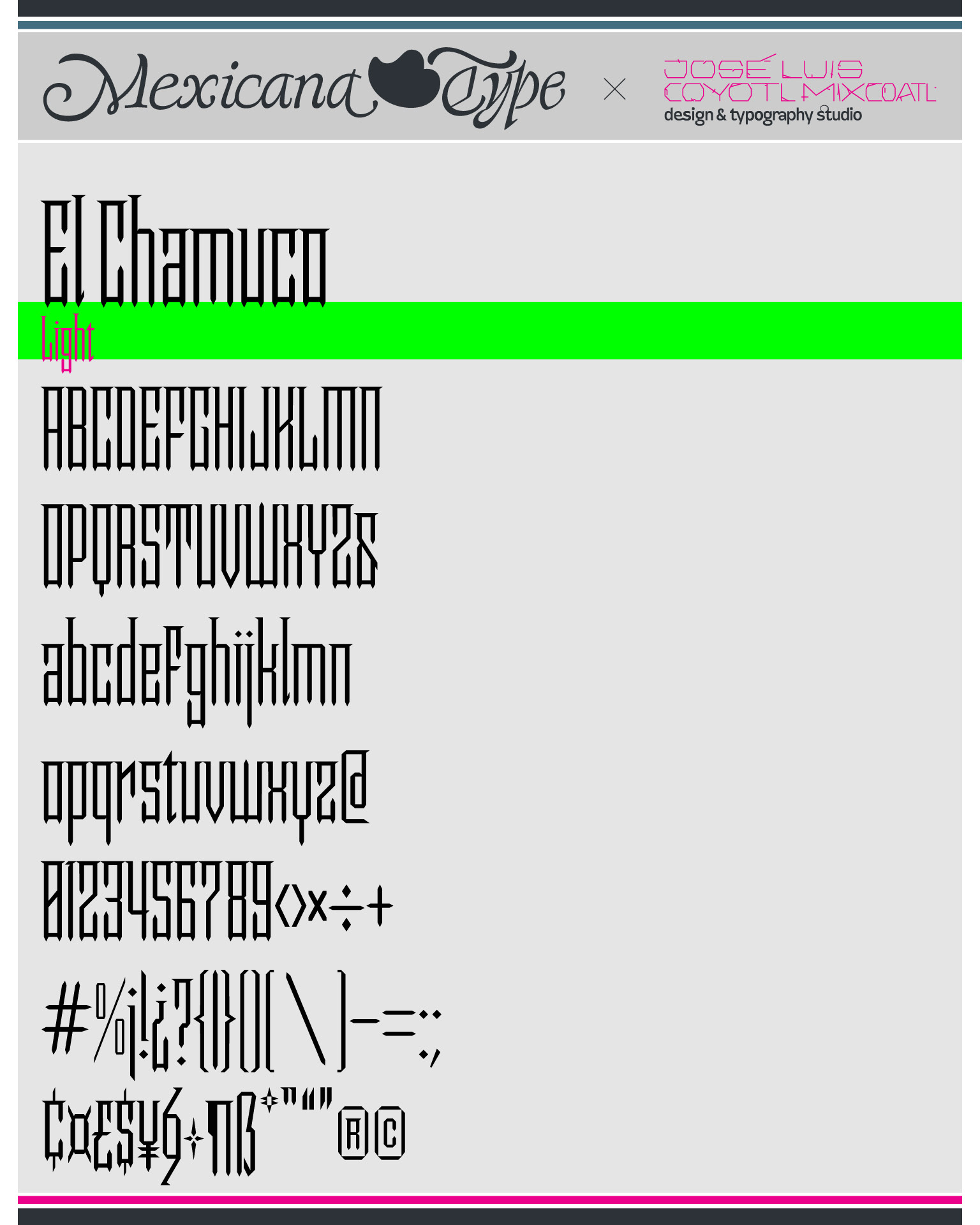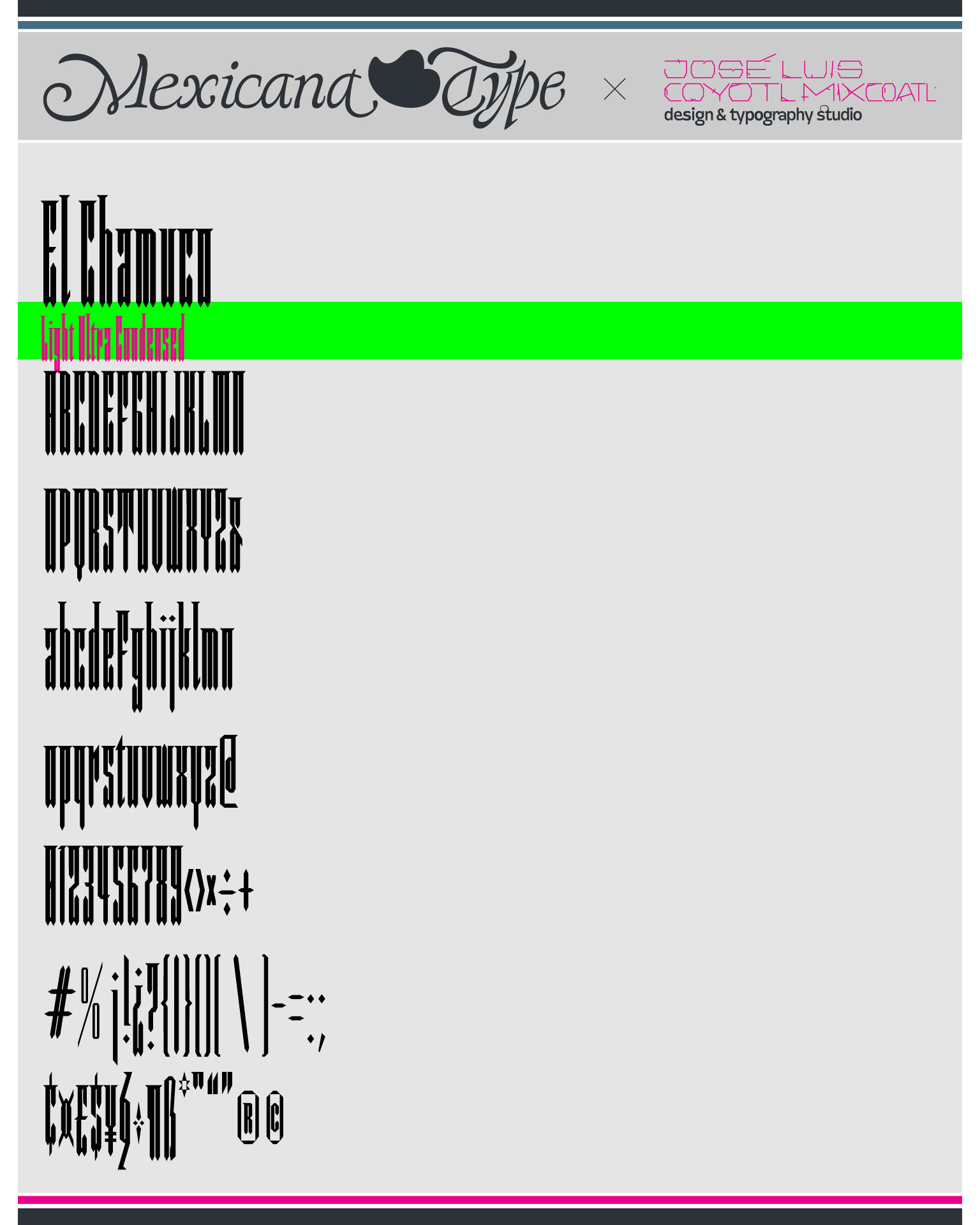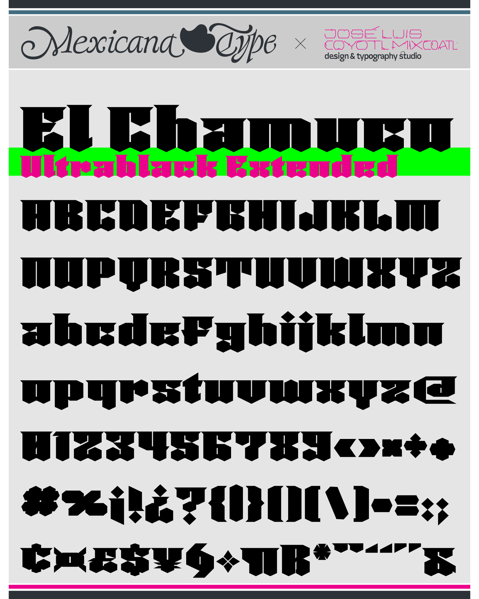 MxT El Chamuco es una tipografía, que es prácticamente la segunda que diseñé, que data de alrededor de 1999 con cuatro pesos, aunque fue ampliada en el 2024 a 13 pesos y variantes con un estilo que remite a algunos trazos, cuerpo y estructura de gótica 'Textur', pero al mismo tiempo con un espíritu modular de letras pintadas a mano y gráfica popular mexicana con un sentido mucho más moderno y contemporáneo. Su diseño permite un flujo de texto de formas contínuas en sus remates y terminaciones, aludiendo a los cuernos, patas y cola de El Chamuco, personaje muy arraigado en la cultura popular mexicana, y de la que a manera de sátira se recrea en cada una de sus variantes, desde la mas extendida hasta las más condensadas en sus diferentes pesos y, aunque es una tipografía para títulos, también tiene variantes estilísticas aún más display que le dan un enfoque muy singular y con las posibilidades de tener combinaciones muy interesantes en sus bloques de textos, permitiendo eficiencia de espacio en todas sus variantes pero también en la riqueza de sus formas.