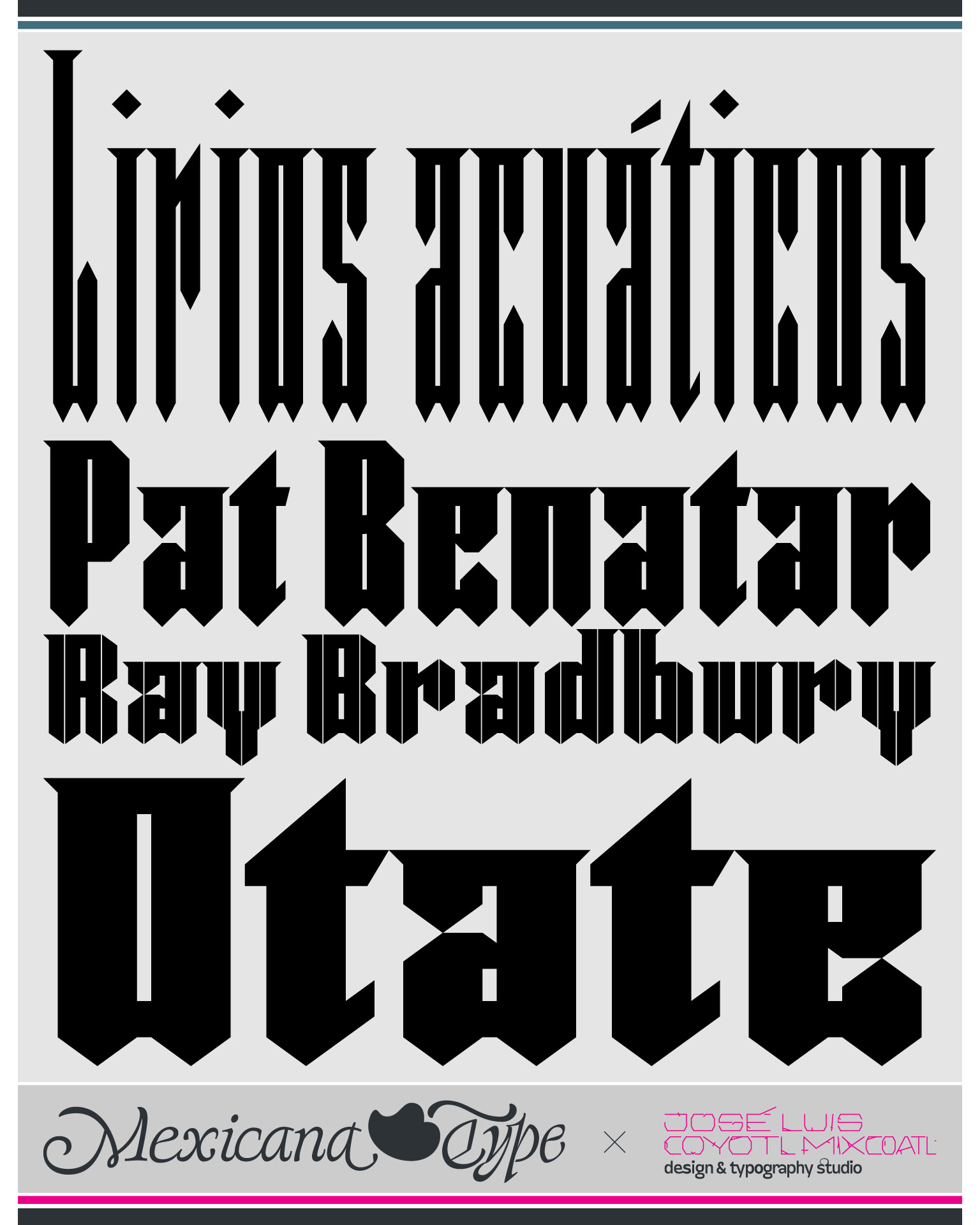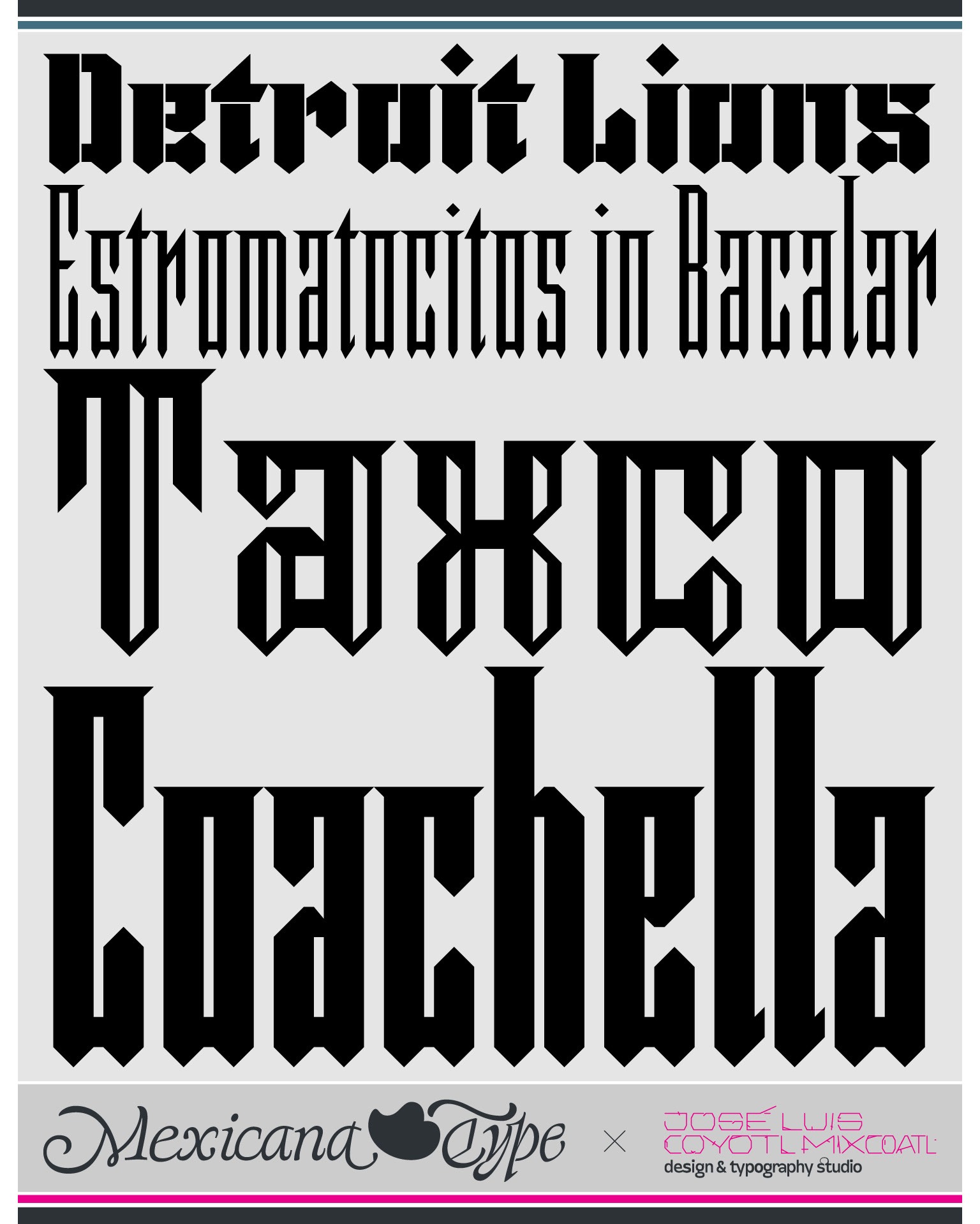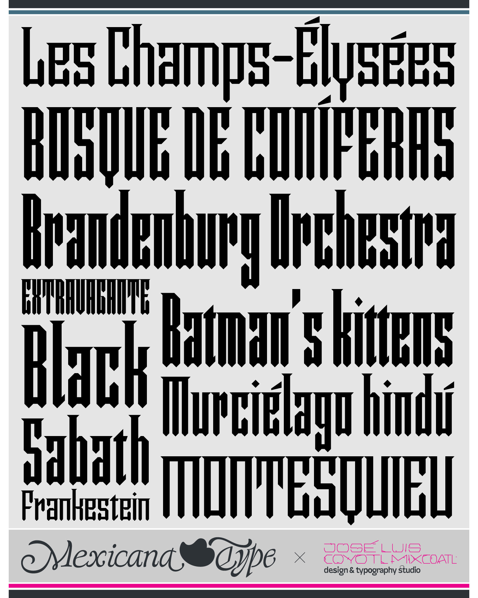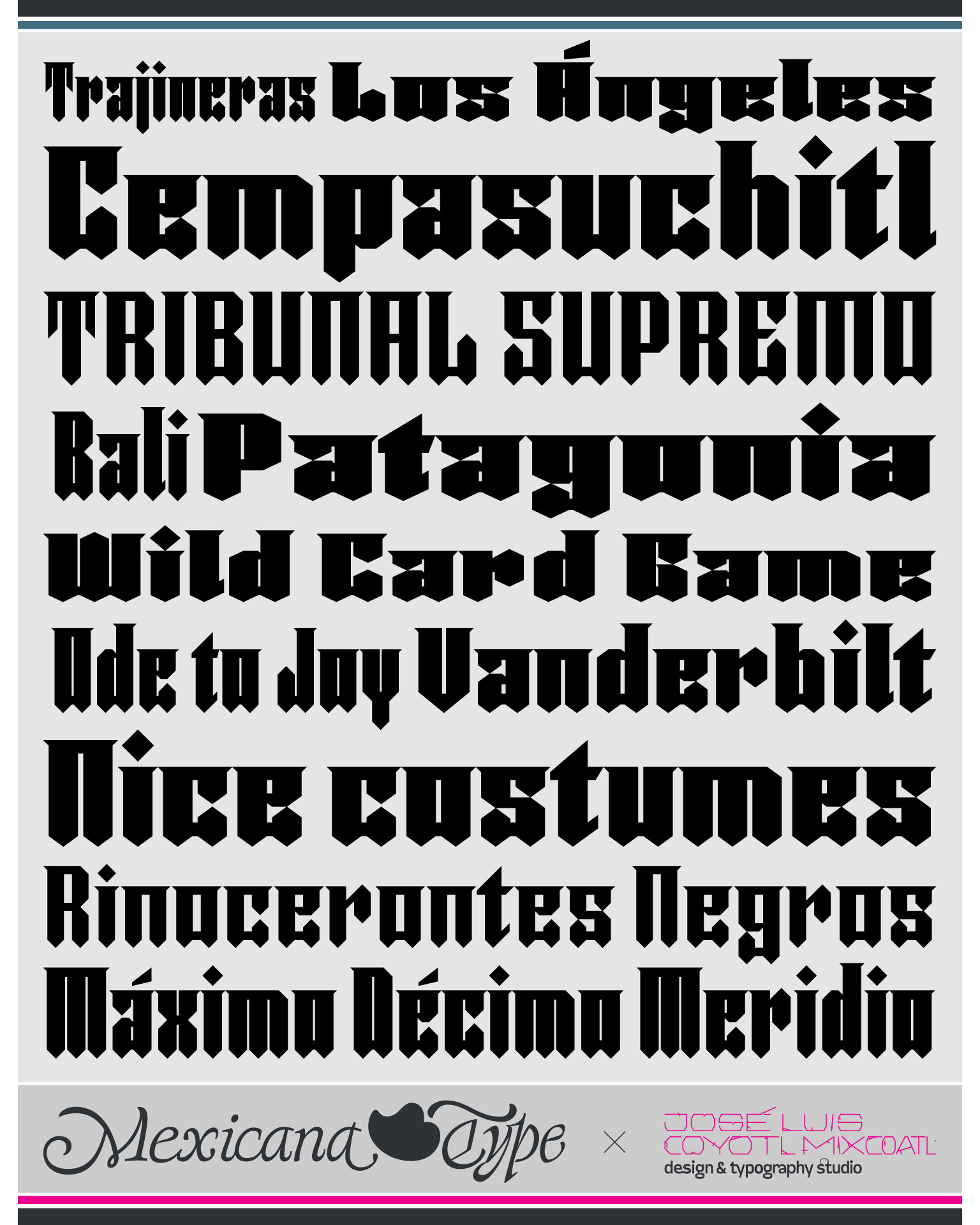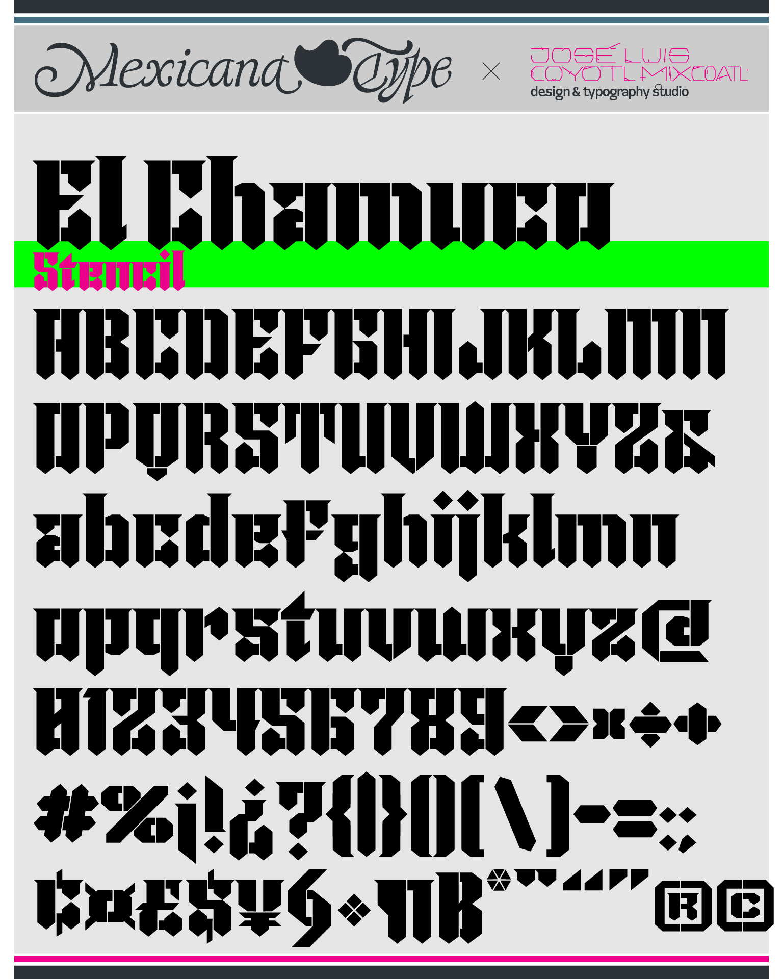 MxT El Chamuco es una tipografía, que es prácticamente la segunda que diseñé, que data de alrededor de 1999 con cuatro pesos, aunque fue ampliada en el 2024 a 13 pesos y variantes con un estilo que remite a algunos trazos, cuerpo y estructura de gótica 'Textur', pero al mismo tiempo con un espíritu modular de letras pintadas a mano y gráfica popular mexicana con un sentido mucho más moderno y contemporáneo. Su diseño permite un flujo de texto de formas contínuas en sus remates y terminaciones, aludiendo a los cuernos, patas y cola de El Chamuco, personaje muy arraigado en la cultura popular mexicana, y de la que a manera de sátira se recrea en cada una de sus variantes, desde la mas extendida hasta las más condensadas en sus diferentes pesos y, aunque es una tipografía para títulos, también tiene variantes estilísticas aún más display que le dan un enfoque muy singular y con las posibilidades de tener combinaciones muy interesantes en sus bloques de textos, permitiendo eficiencia de espacio en todas sus variantes pero también en la riqueza de sus formas.