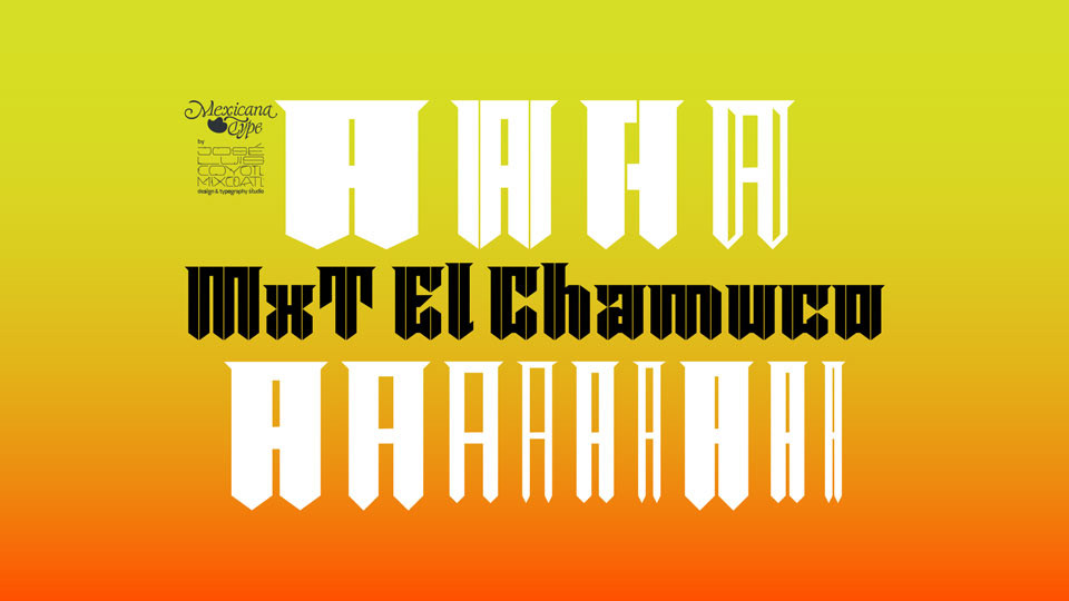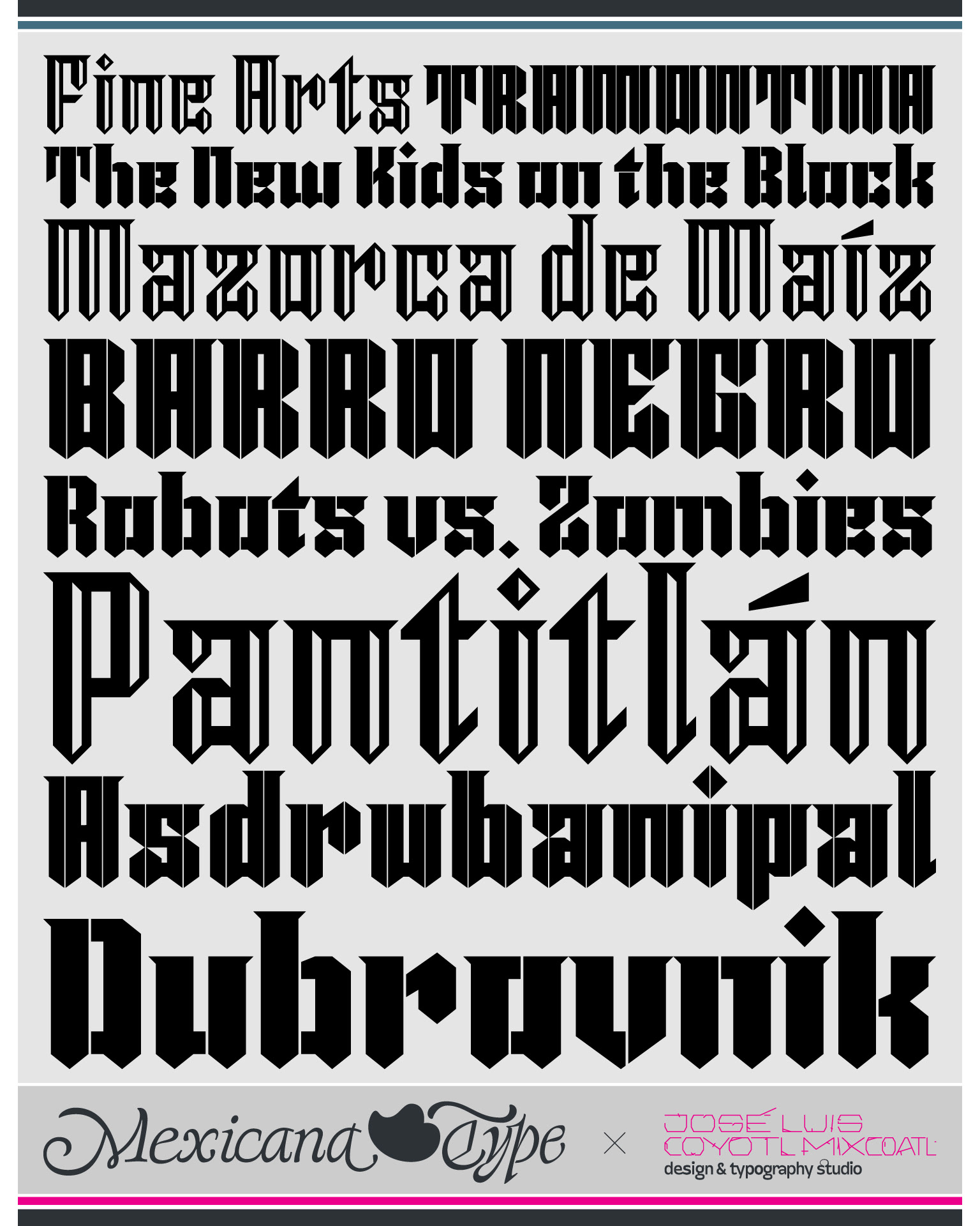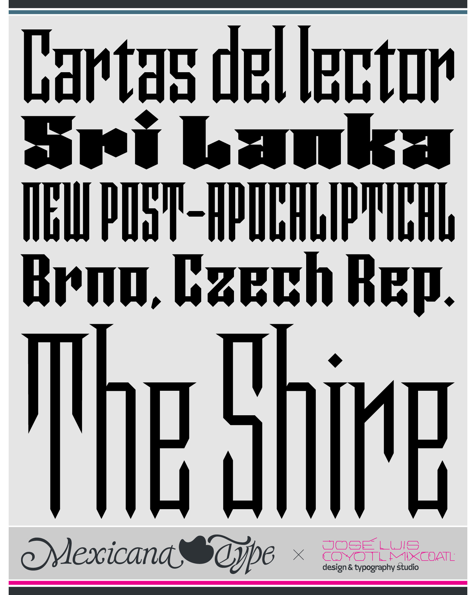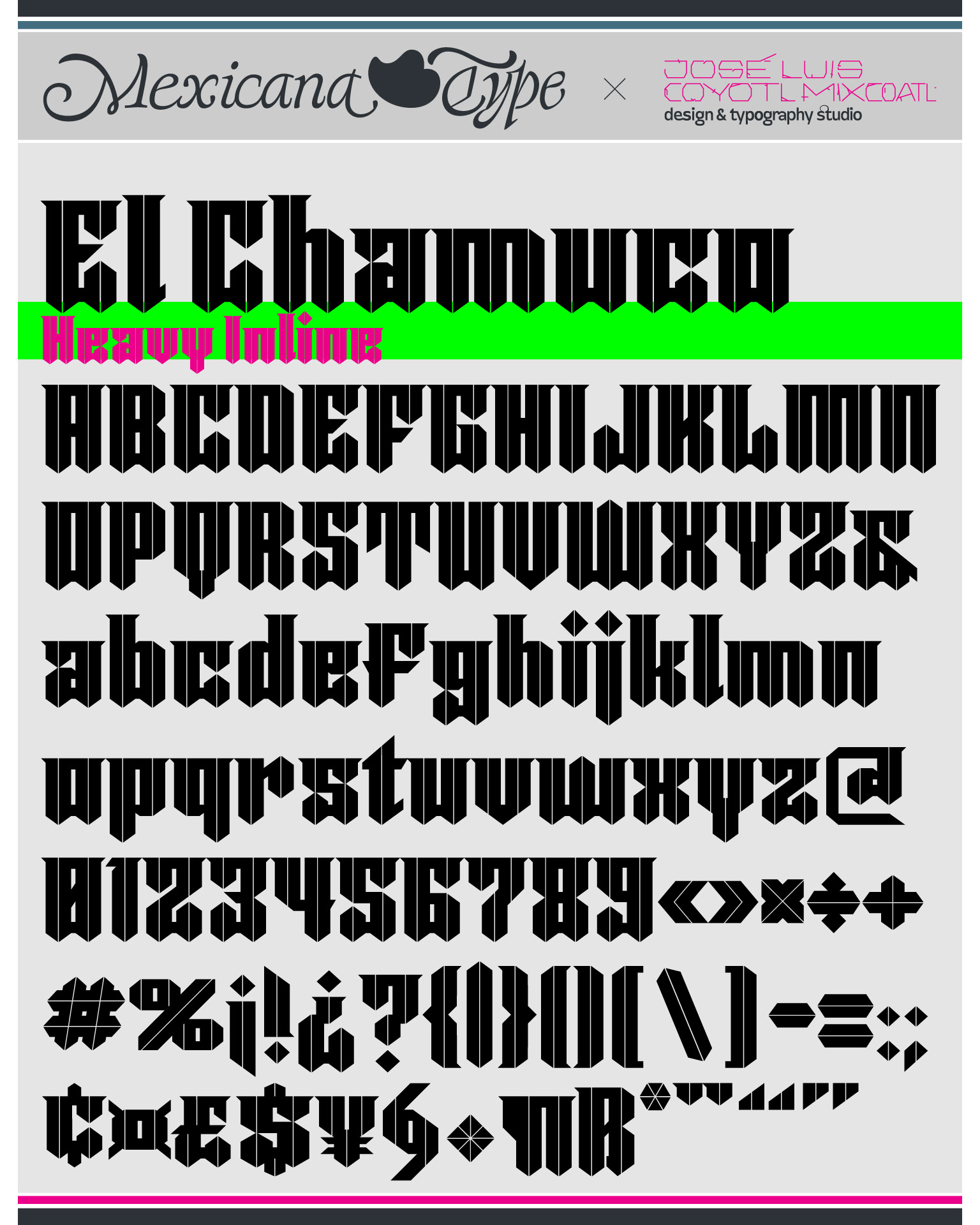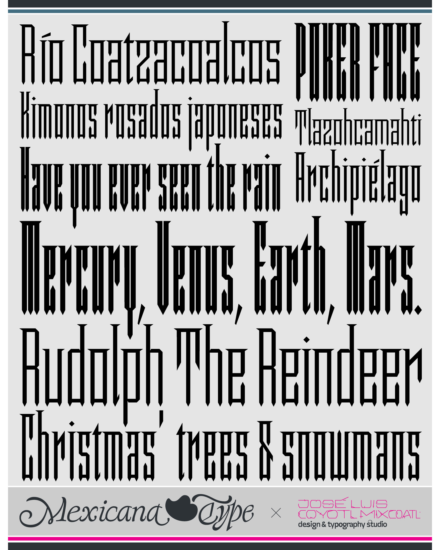 MxT El Chamuco es una tipografía, que es prácticamente la segunda que diseñé, que data de alrededor de 1999 con cuatro pesos, aunque fue ampliada en el 2024 a 13 pesos y variantes con un estilo que remite a algunos trazos, cuerpo y estructura de gótica 'Textur', pero al mismo tiempo con un espíritu modular de letras pintadas a mano y gráfica popular mexicana con un sentido mucho más moderno y contemporáneo. Su diseño permite un flujo de texto de formas contínuas en sus remates y terminaciones, aludiendo a los cuernos, patas y cola de El Chamuco, personaje muy arraigado en la cultura popular mexicana, y de la que a manera de sátira se recrea en cada una de sus variantes, desde la mas extendida hasta las más condensadas en sus diferentes pesos y, aunque es una tipografía para títulos, también tiene variantes estilísticas aún más display que le dan un enfoque muy singular y con las posibilidades de tener combinaciones muy interesantes en sus bloques de textos, permitiendo eficiencia de espacio en todas sus variantes pero también en la riqueza de sus formas.