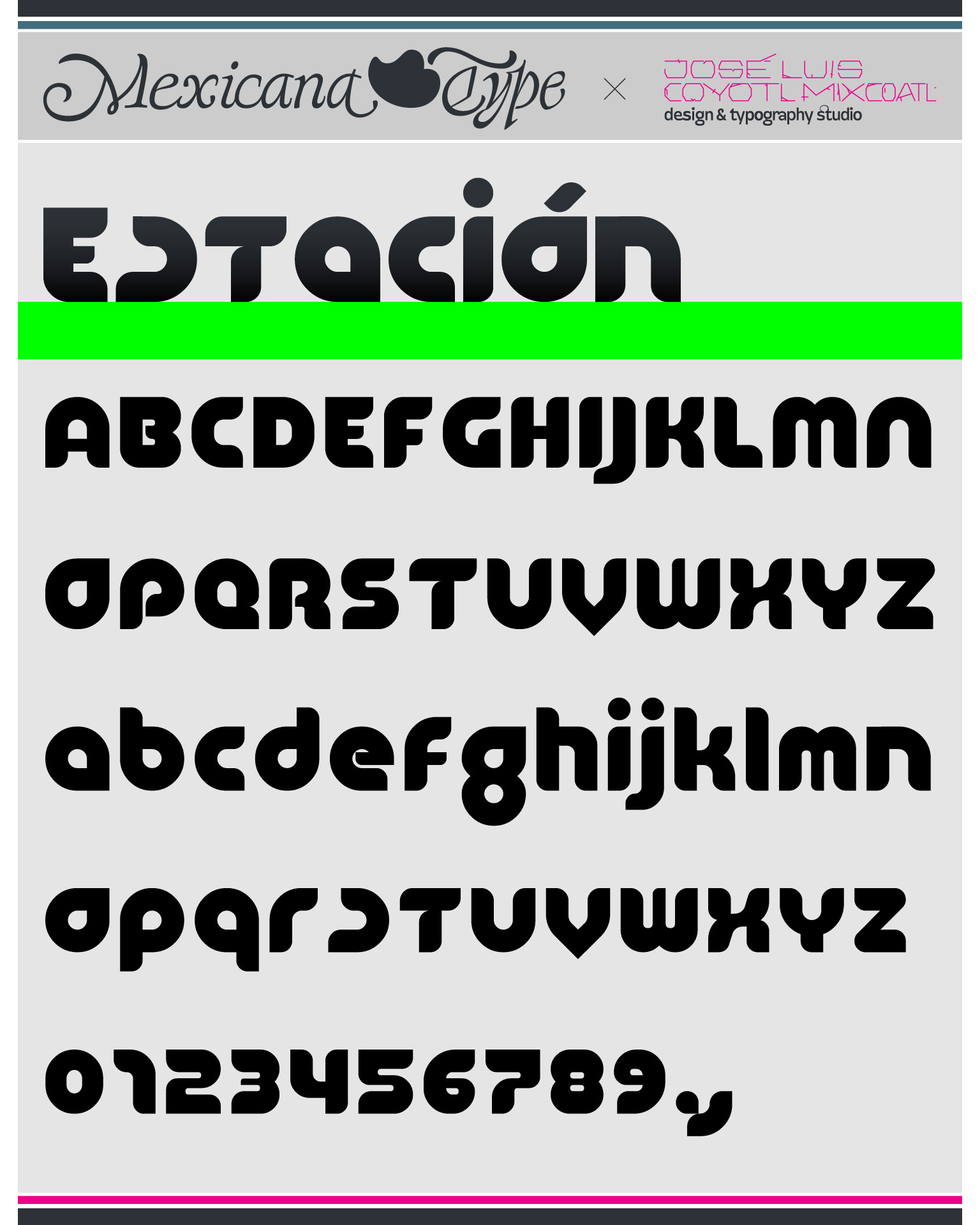 Los trazos de MxT Estación son geométricos, basados en una retícula cuadrada bastante sencilla y con módulos circulares y rectos que forman cada caracter de una forma simple y equilibrada con poco contraste de grosor de trazo, estos a su vez van en función al desarrollo de la propuesta de marca que se estaba desarrollando, y con ello también tienen un sistema de proporciones con altas/mayúsculas poco altas en relación a la altura X de las minúsculas/bajas, pero también ascendentes y descendentes cortas. En conjunto, al final se tienen un mapa de caracteres sólido y compacto, simpática y acentos visuales interesantes en la mancha tipográfica y creación de bloques de texto.