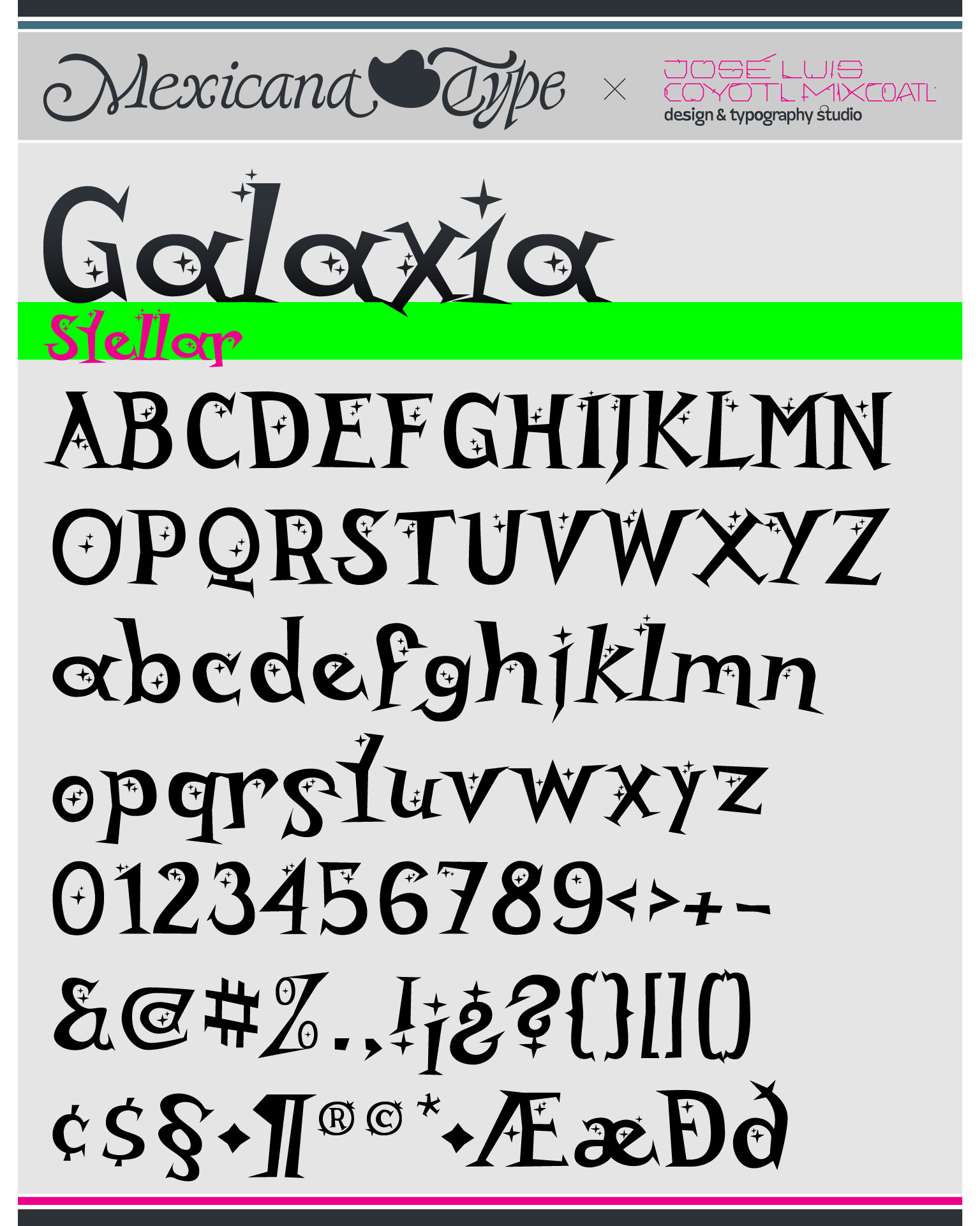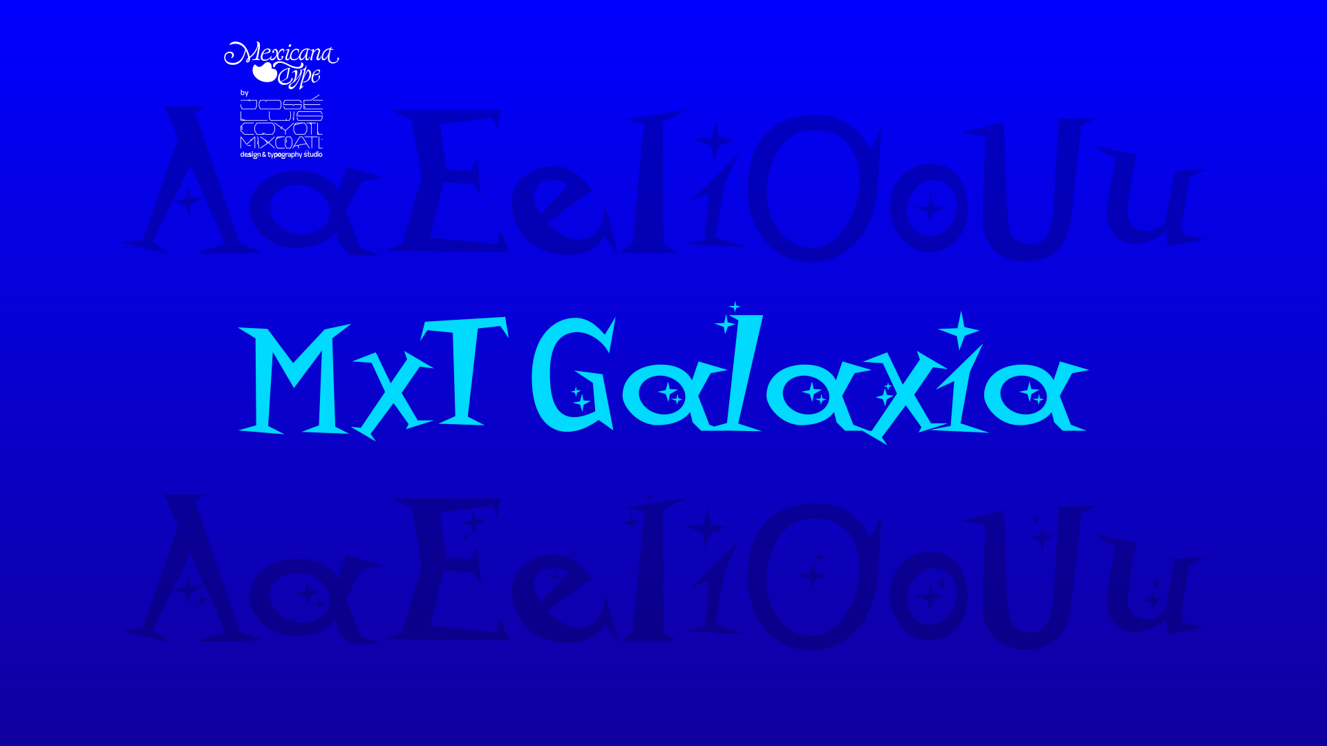 MxT Galaxia fue inspirada por dibujos animados y series de televisión con estética espacial, con un toque más relajado y un tanto con humor caricaturesco, pensada como una tipografía con apariencia de contrastes variados e irregulares en su estructura que generara un cuerpo de texto dinámico y estilizado. La aparente ausencia de una línea base y alturas X en sus altas y bajas tienen como intención la sensación de que las letras parezcan flotar y dar movimiento a los bloques de texto que van formando, que aunque si bien está pensada para palabras y frases cortas, también tiene su gracia en manchas de texto un poco más largos.
