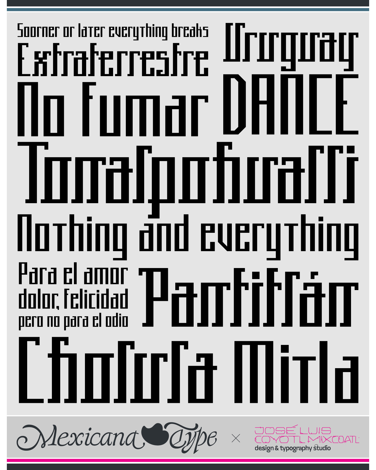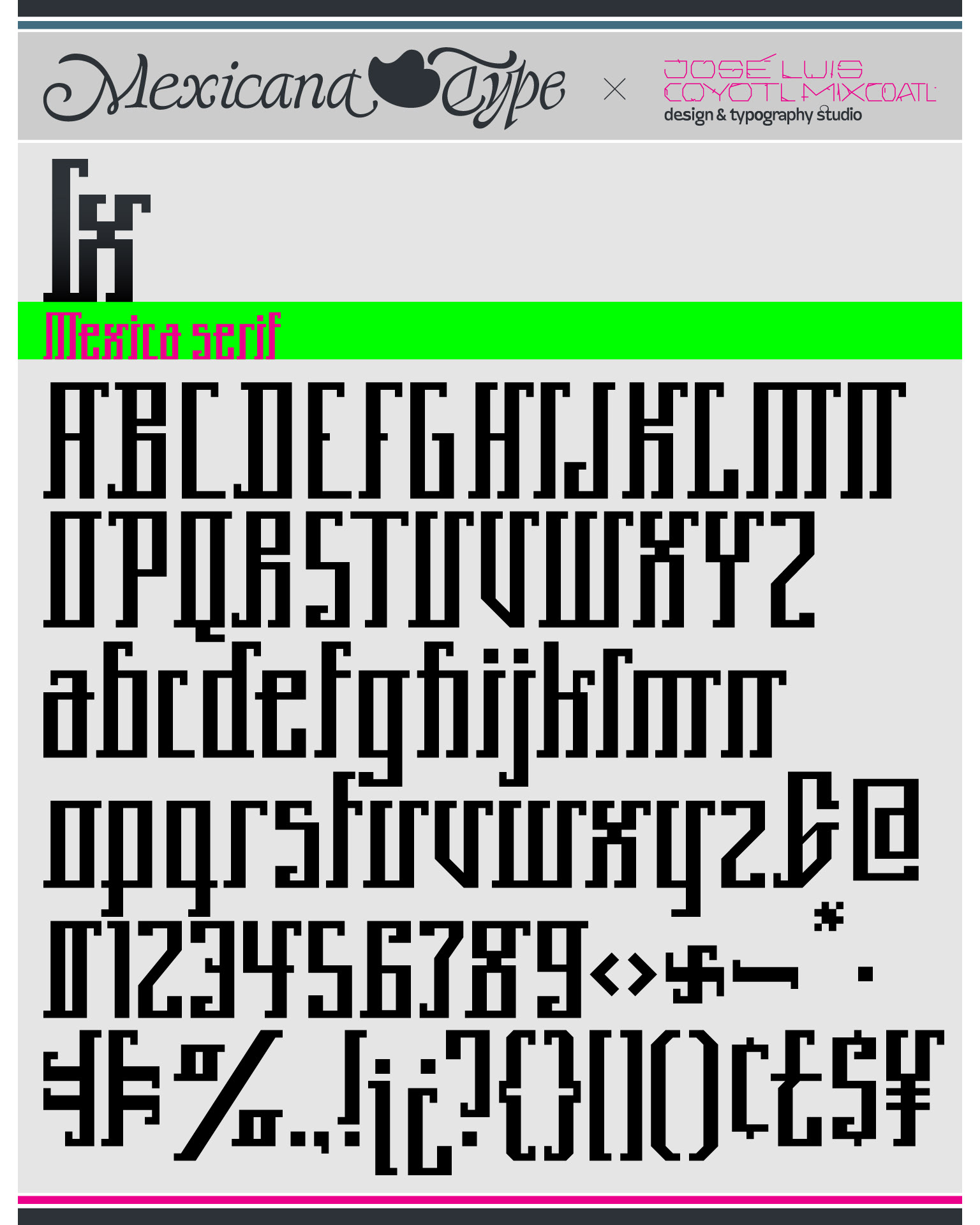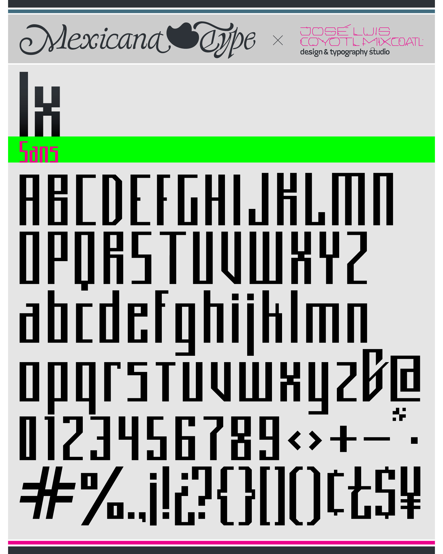 A partir de una retícula muy sencilla y el juego modular de dos grosores de línea y casi monoespaciada, MxT Ix fue mi primer intento de formalizar una tipografía mientras estaba en mi etapa de estudiante en la licenciatura de Diseño Gráfico, de la cual salieron dos variantes: Sans y Mexica Serif. De trazo simple con formas rectas y cuerpo condensado, basado en grecas y patrones gráficos de estética prehispánica, aunque al final también remite a otras referencias gráficas como el constructivismo, el posmodernismo industrial y estilos de escritura de otras culturas que también basan su estructura en estas formas modulares. Aunque su diseño es simple, también es compleja que la hace un tanto complicada de leer, pero justo en ello está también su gracia, pues sus atributos van también a que puede ser un elemento decorativo muy interesante por lo alto de sus proporciones y condensado de su ancho, así como en la uniformidad sobre todo de sus terminaciones y trazos verticales.