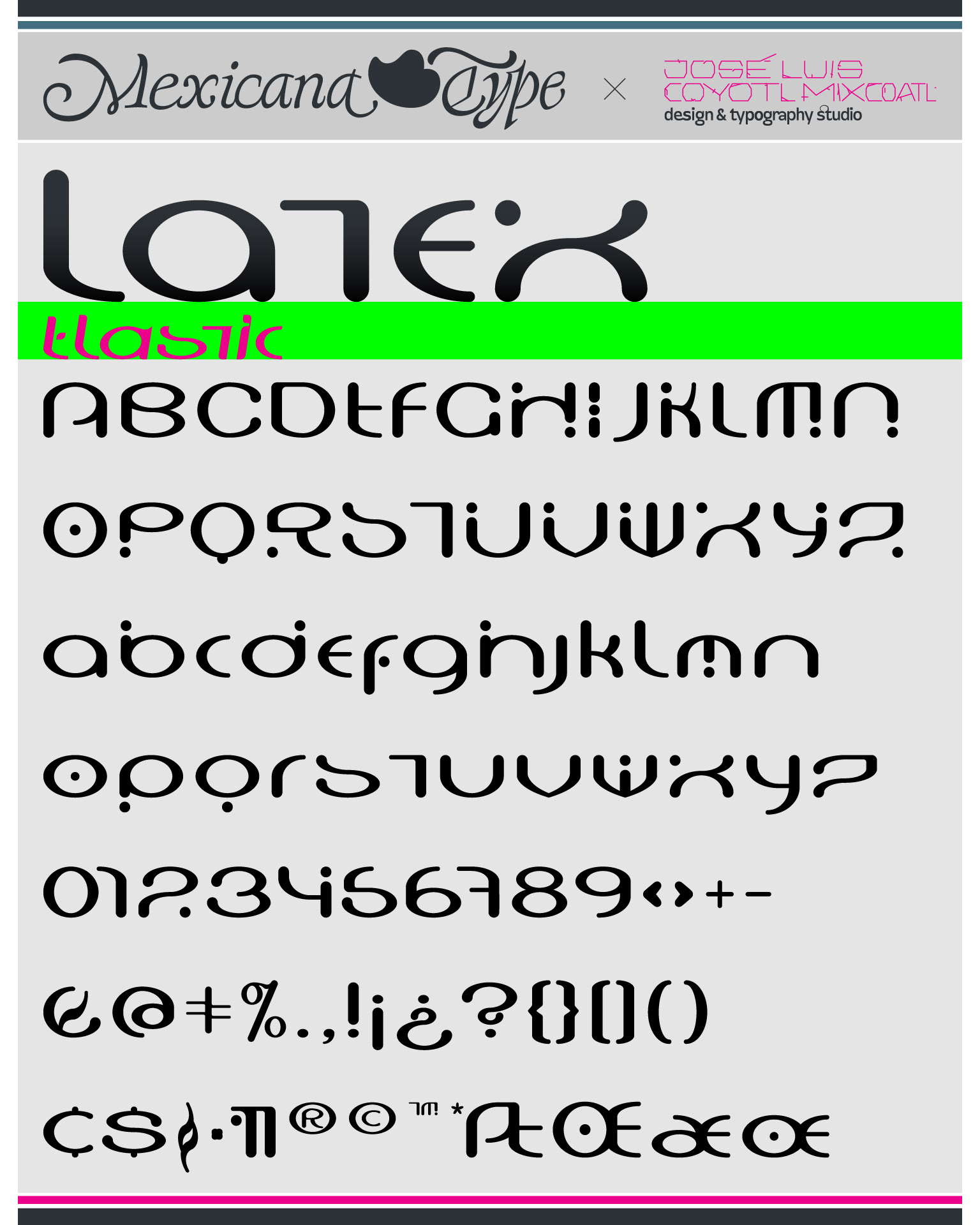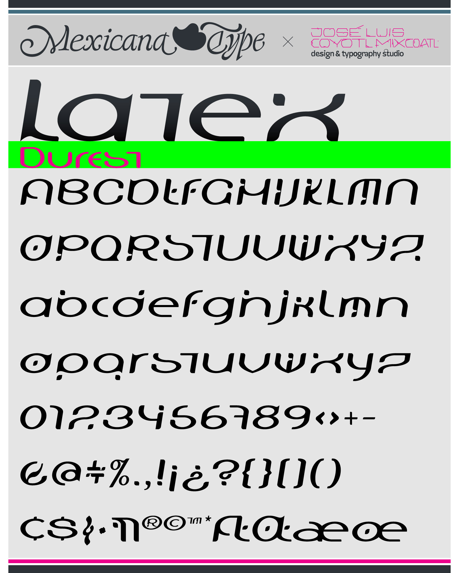 El desarrollo de MxT Latex en su momento, a inicios de los 2000, explora una combinación entre lo experimental, lo techno y lo orgánico. Su base estructural en el cuerpo de la letra es completamente modular, en las que curvas y rectas del cuerpo de cada letra, asi como detalles y terminaciones a manera de remates visuales de algunos de sus trazos, en conjunto con la anchura de su cuerpo y las proporciones de sus alturas en altas y bajas, así como en sus ascendentes y descendentes, la definen y le dan una personalidad muy particular, haciéndola compleja y simple a la vez. Es una tipografía rica en textura tipográfica en textos cortos y medianos e interesante como cuerpo de texto, cualquiera que sea su aplicación, siempre dará un display atractivo y expresivo.