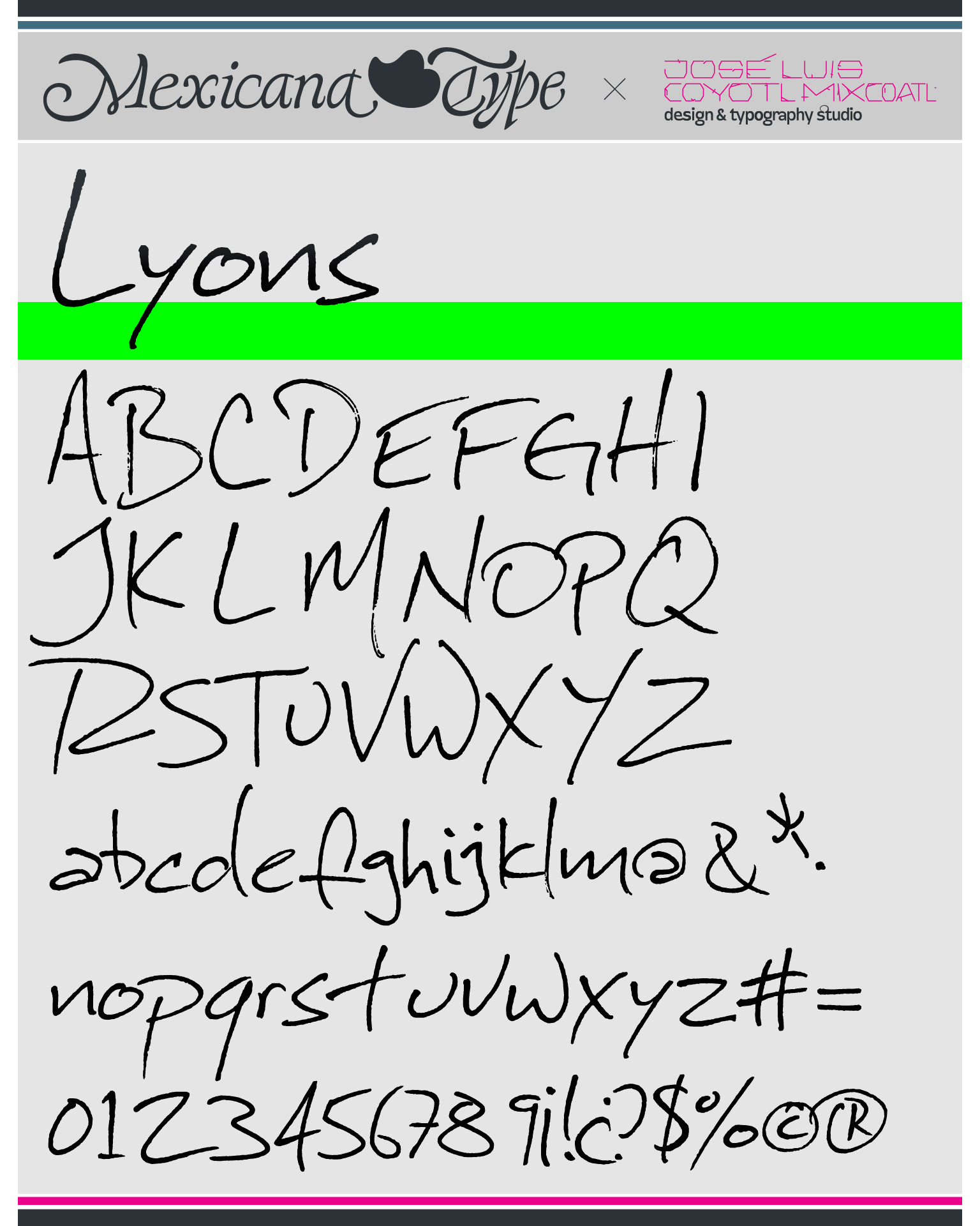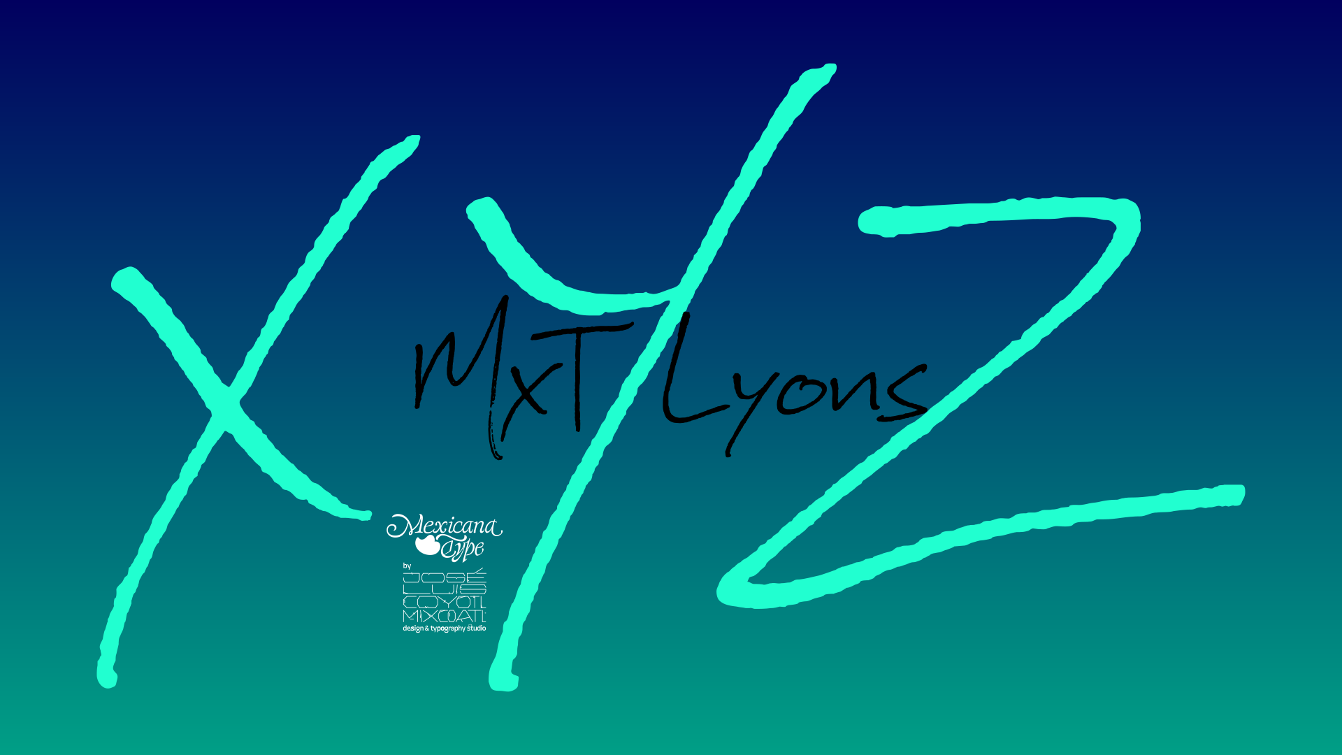 MxT Lyons fue un desarrollo custom font para el músico de Seattle, WA, Rob Lyons, cuya carrera ha ido desde Broadway a su proyecto solista. En éste caso, MxT Lyons fue hecha para su disco debut "When it haunts you". Rob quería una tipografía que fuera expresiva y tuviera la fuerza personal que tiene su música, mismo estilo que se desarrollaría también para su logo personal. De modo que se desarrolló un estilo de letra escrita que compusiera primero su nombre, y una vez concretado, se tomó como base para el desarrollo de caracteres faltantes en altas, bajas, números, diacríticos y números. Con un estilo que imita el trazo de las letras con bolígrafo, con un trazo uniforme pero también con partes que le dan velocidad. Evidentemente carece de una retícula de trazo, las proporciones de los caracteres sin asimétricas y no hay una línea base aparente que dé una guía visual de alineamiento de los caracteres, pero es la intención, que tenga una sensación de escritura casual y expresiva.
