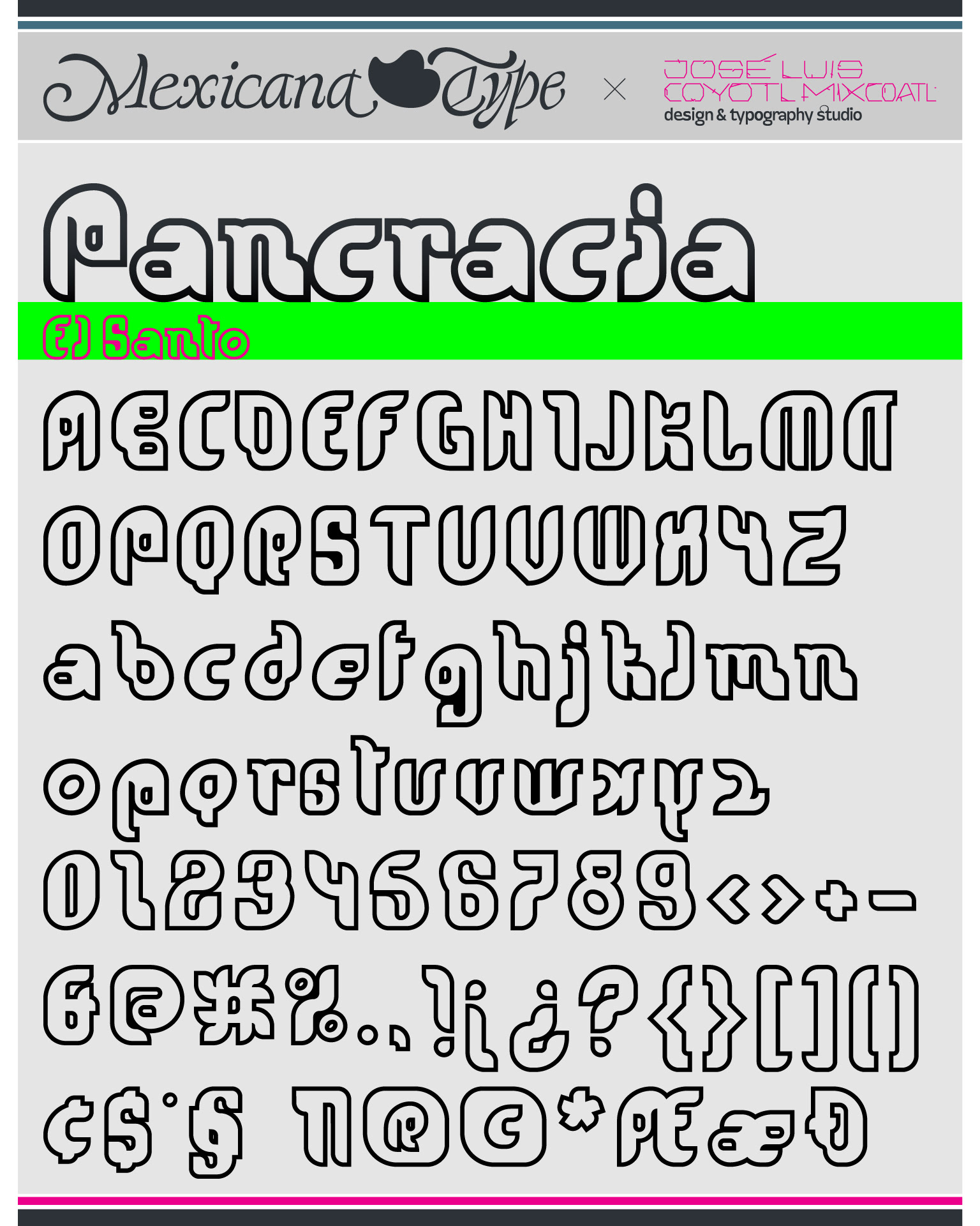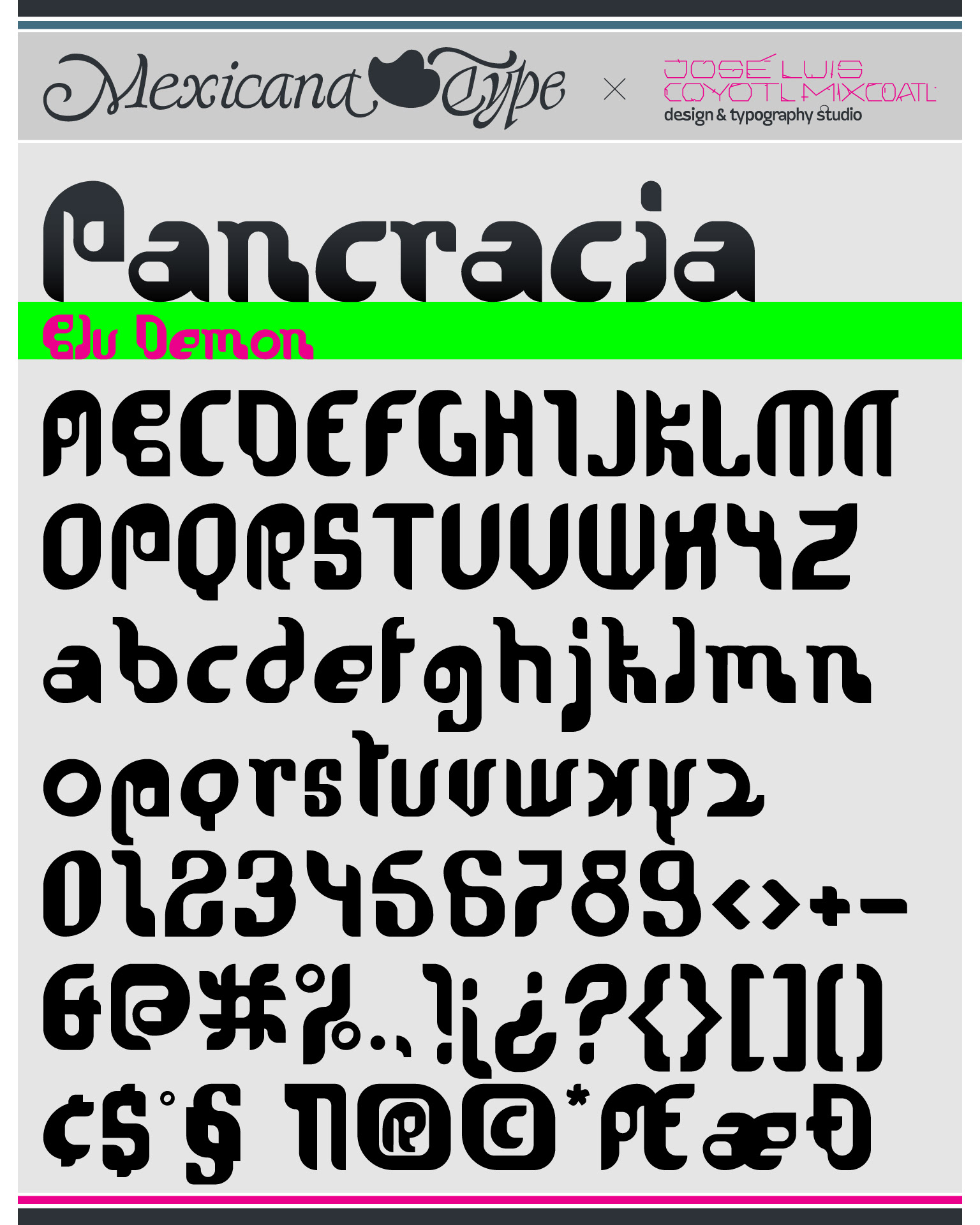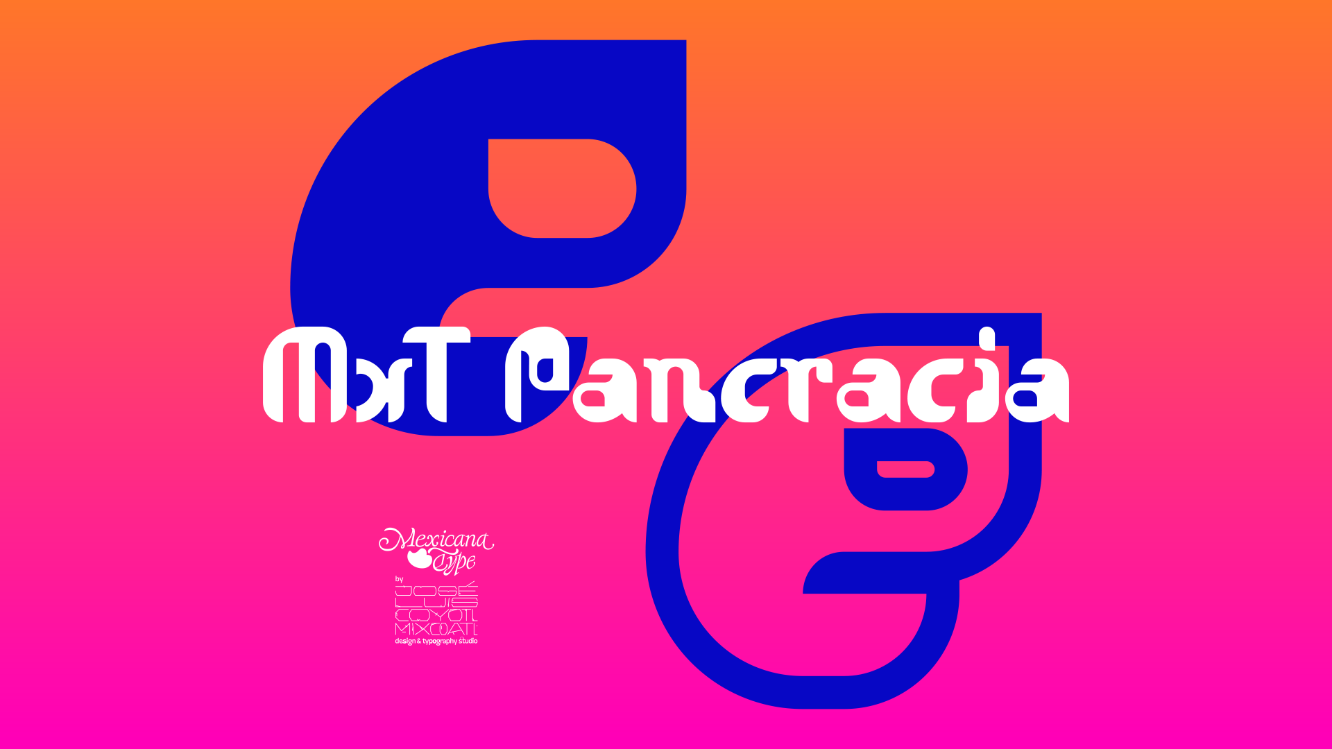 MxT Pancracia nace de la exploración iconográfica y como fenómeno cultural de la lucha libre, siendo ésta una de las expresiones más representativas de la cultura popular mexicana, por lo que influenciado por la gráfica de máscaras y atuendos de luchadores, particularmente de El Santo y Blue Demon, se inspiró ésta tipografía. Con un aire vernáculo, que se rinde a la desproporción y al juego de formas modulares pero irregulares al mismo tiempo. Los caracteres de MxT Pancracia juegan a la acrobacia, a ser expresivas, a ser divertidas y juguetonas en su textura tipográfica, un poco techno y otro poco orgánica, es varias cosas a la vez. Es un experimento lúdico e iconográfico, como en las ‘e’ minúsculas se nota una forma una abstracción del perfil de las mascaritas de cada una de sus versiones: MxT Pancracia Blu Demon y MxT Pancracia El Santo.