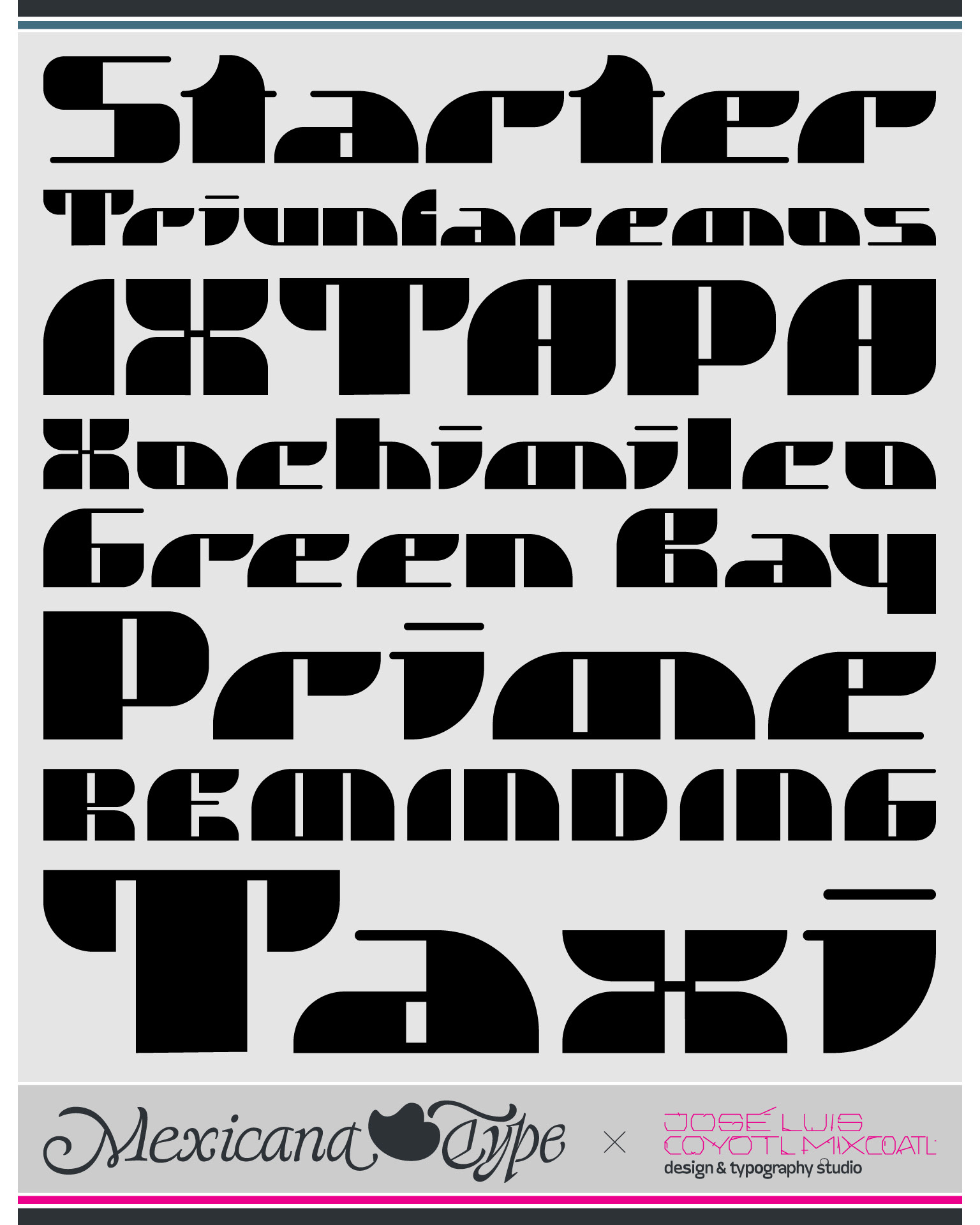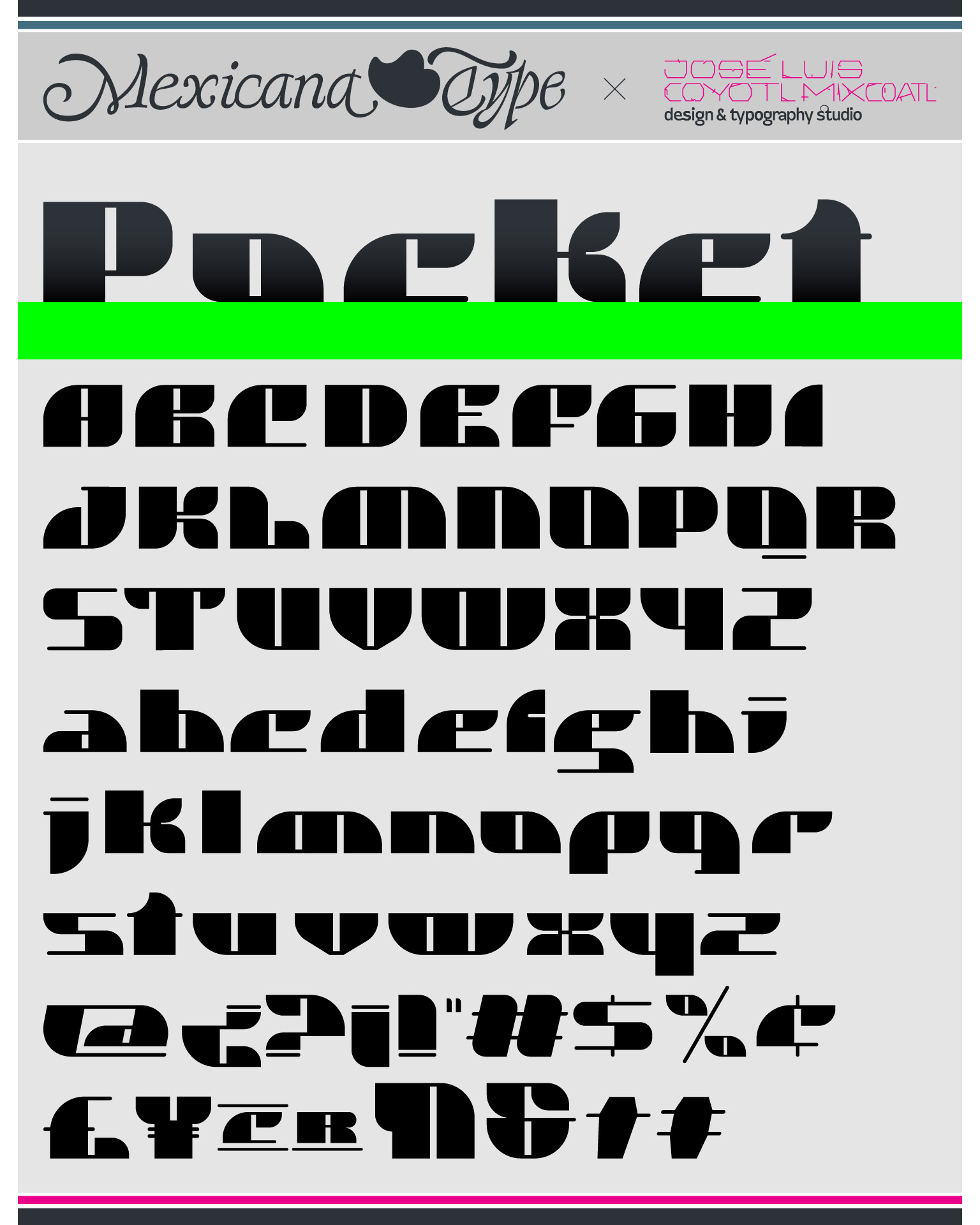 MxT Pocket fue una de mis primeras tipografías, diseñada alrededor del año 2000, que experimentaba contrastes bien marcados de modulación simple y juego de proporciones asimétricas, contrastes extremos y terminaciones cuadradas y redondas en sus trazos verticales gruesos y sólidos, con horizontales ligeros, lo que genera contraformas interesantes. Si bien es un proyecto que experimentaba con las proporciones y las formas, con una mancha tipográfica muy marcada por los trazos verticales, pero con ello generando bloques de texto bien contrastado con una personalidad display inconfundible.