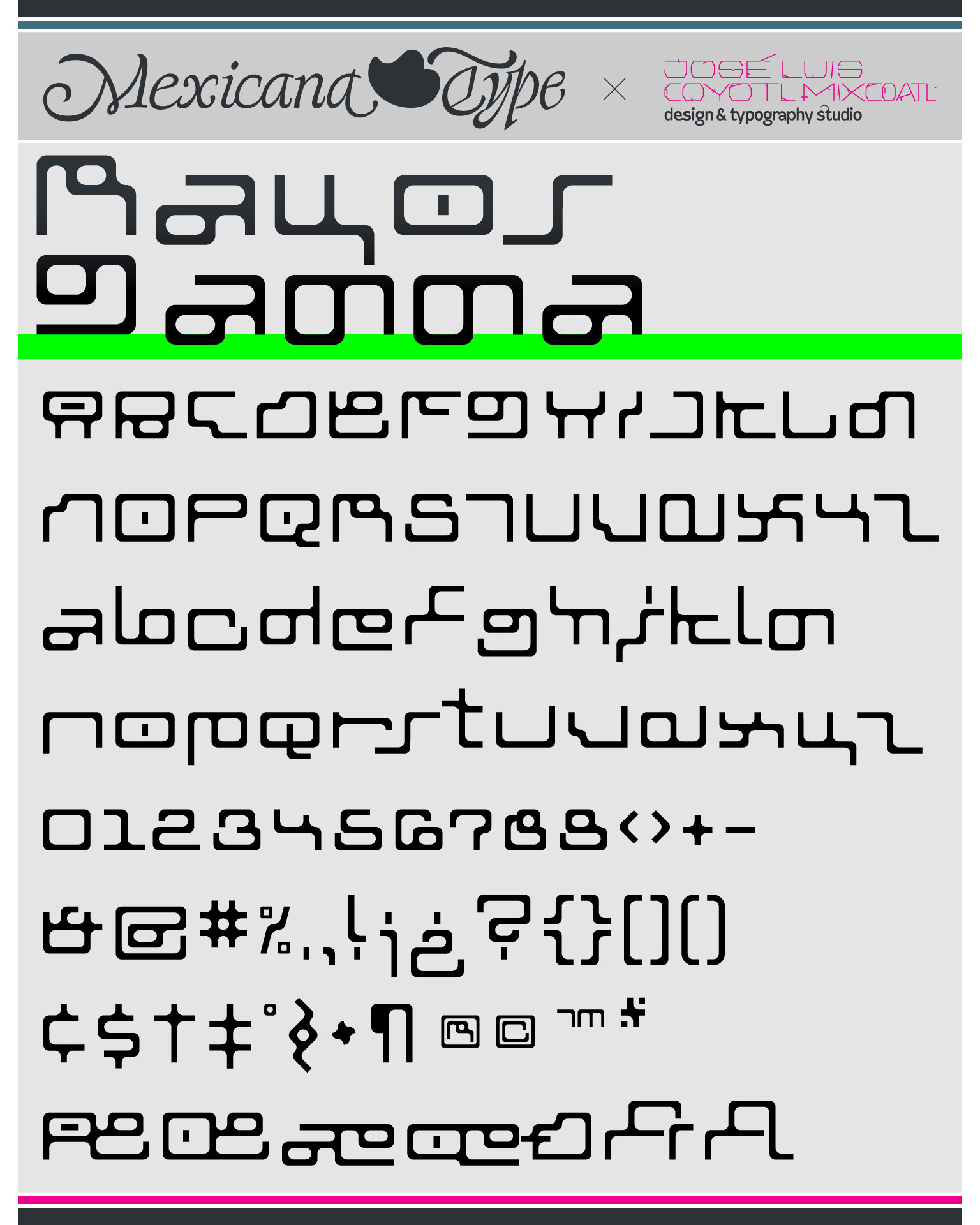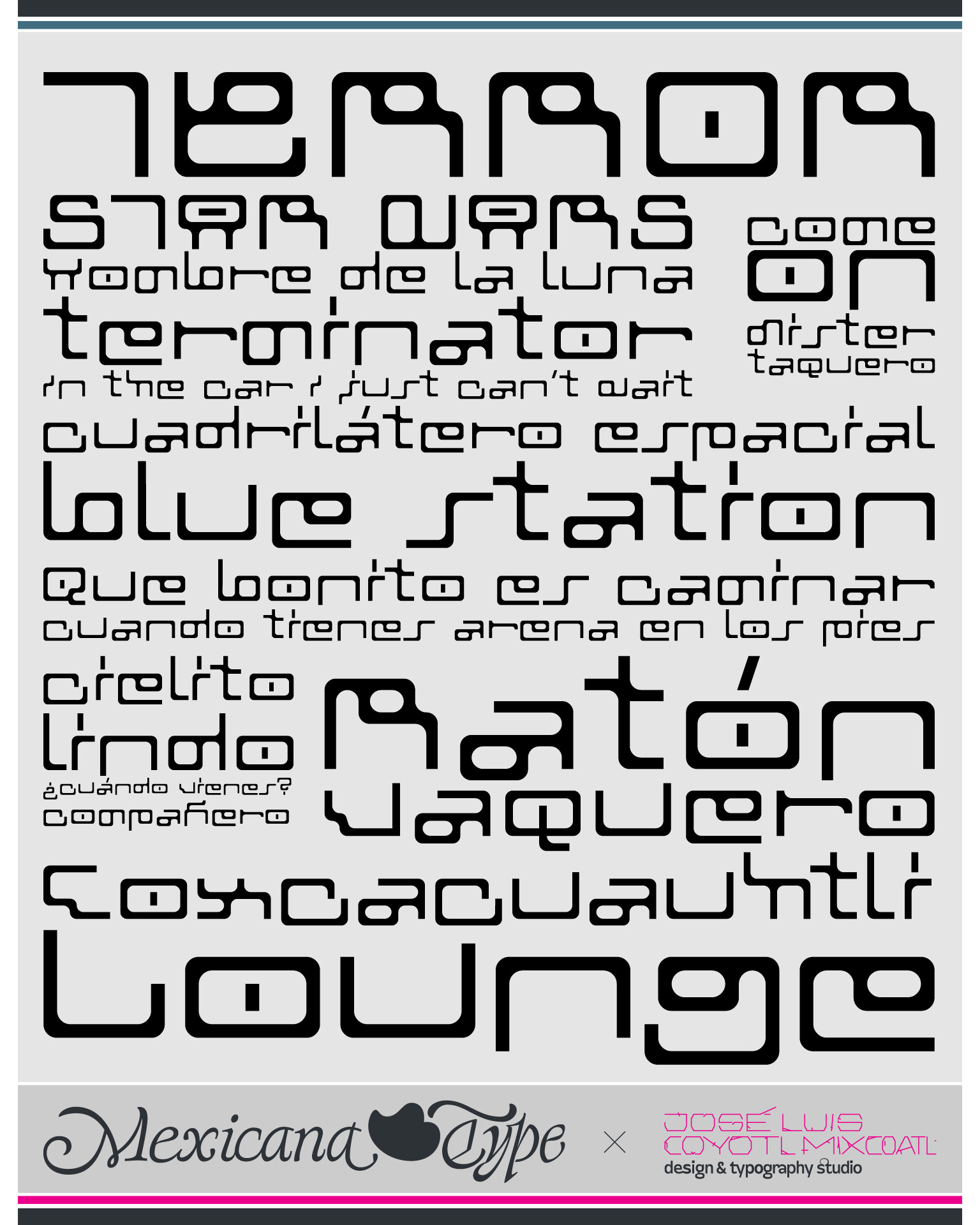 MxT Rayos Gamma es una interpretación personal del mobiliario futurista y sci-fi vintage de mediados del siglo XX, con un espíritu mas nostálgico y retro, lo que permite experimentar más con juegos de formas de las letras y lecturas intrincadas, con un ritmo mucho mas gráfico y ecléctico. Siendo un gran aficionado al diseño industrial, la estructura de las letras tiene fuertes reminiscencias a la gráfica de medio siglo, con elementos que remiten a estructuras tubulares o en madera, con cieeto aire minimalista, pero al mismo tiempo con formas que rompen la asimetría y la alineación a momentos puede parecer y estar llena de momentos provocadores.
