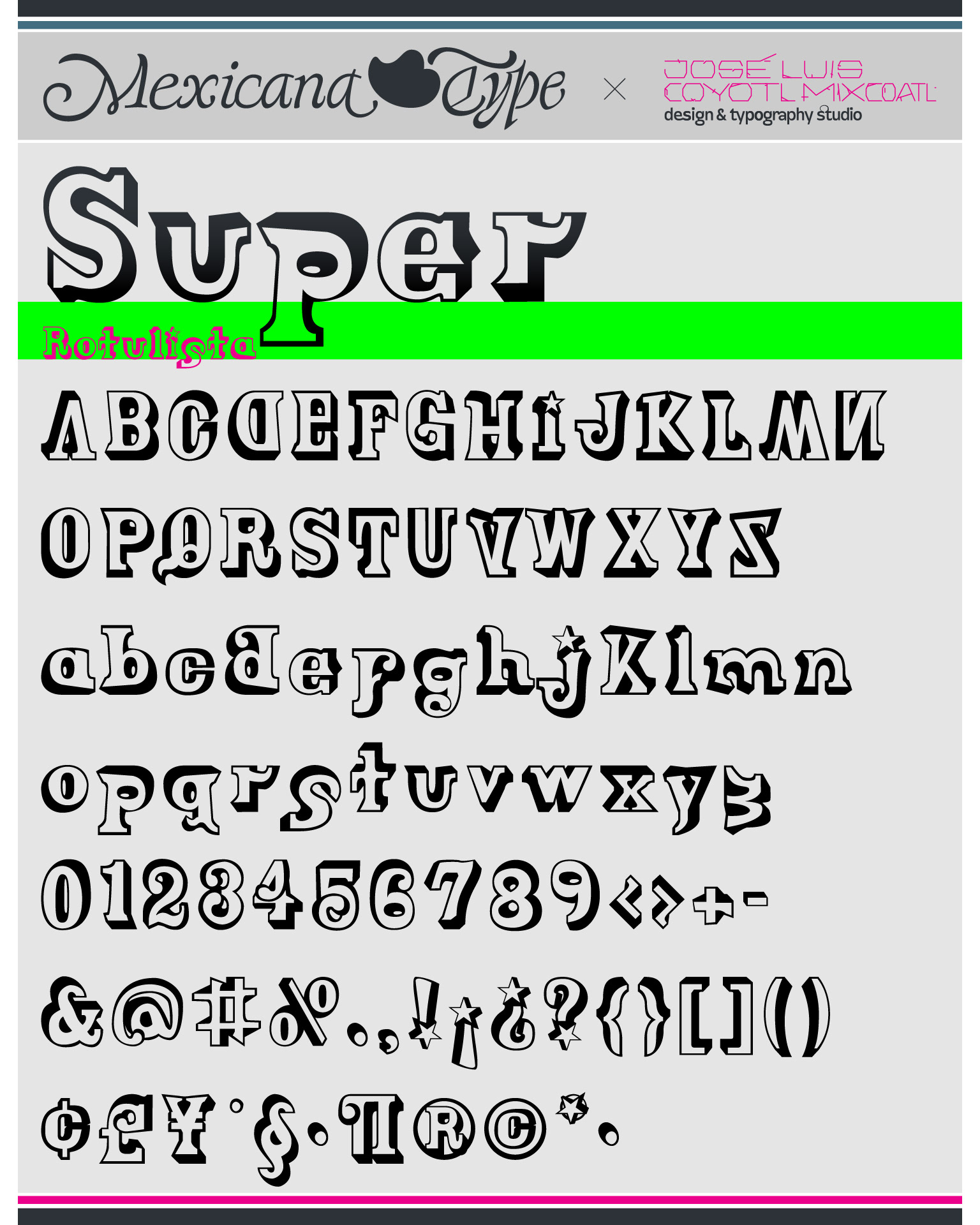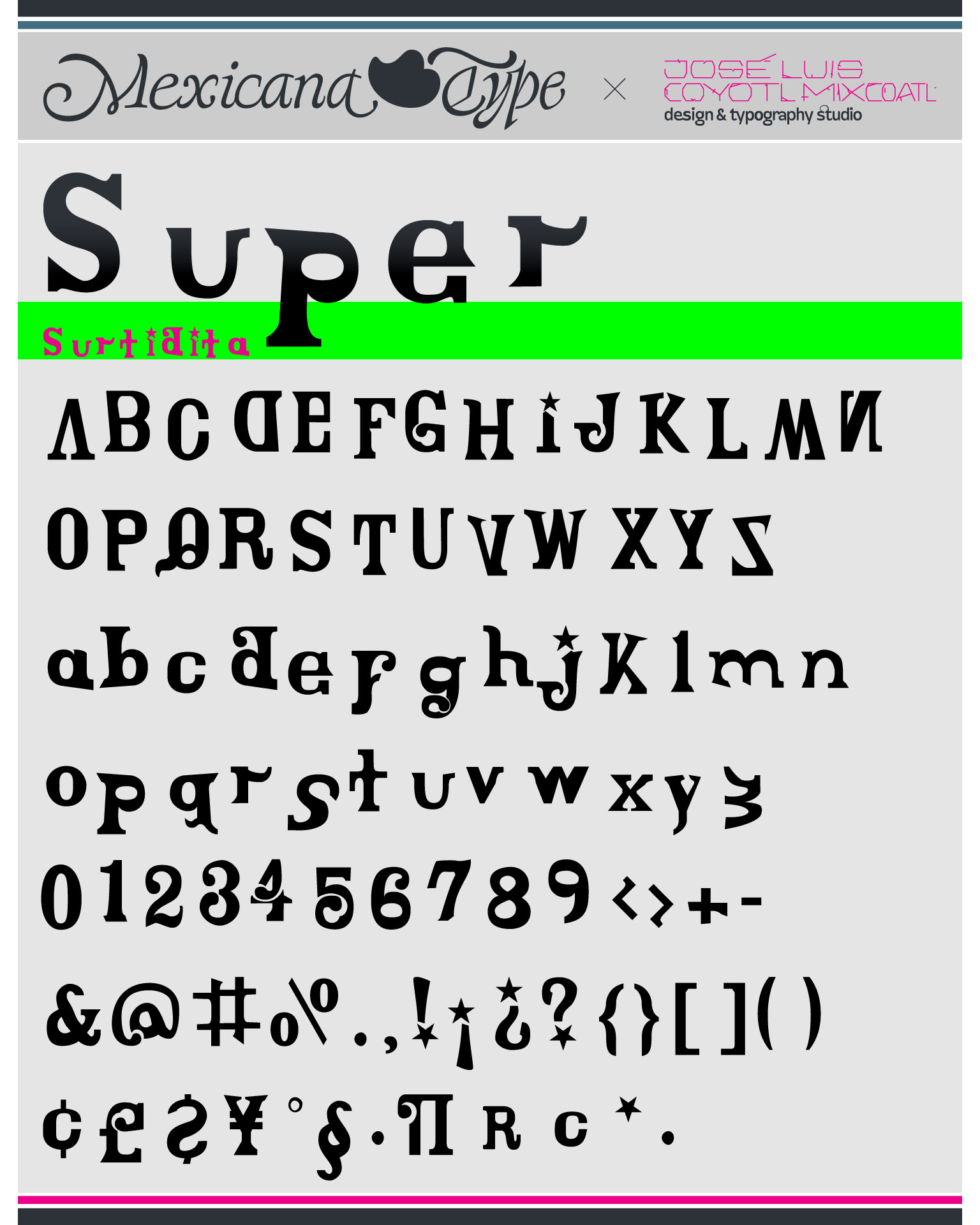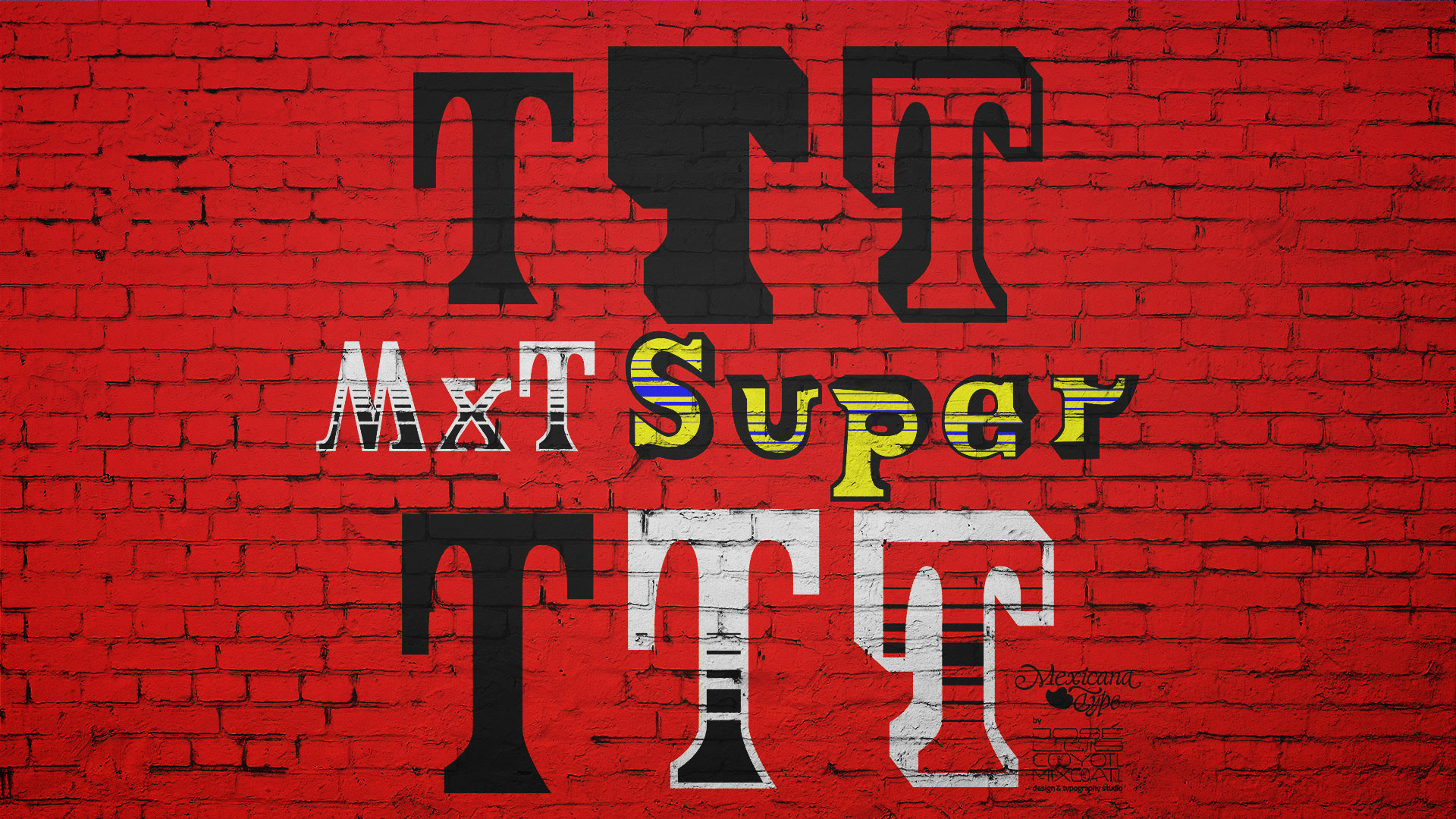 MxT Super es una familia de tipografías influenciadas por las pintas y rótulos del Centro y Sur de México principalmente. Diseñadas con espíritu vernáculo y haciendo referencia al superlativo recurrente para resaltar los nombre y giros comerciales de negocios en zonas populares como: Superpollería Juanita o Super Ofertas, son ejemplos de ello. Super es el resultado de varias combinaciones y estilos de trazo de las letras de rótulo, que combinan o emulan letras existentes, asi como efectos y perspectivas raras y torcidas de las letras de barda, a logotipos de sonidero, letras mochas de imprenta, impresiones imperfectas de carteles para bailes populares, de lucha libre y box, de peregrinaciones y ferias locales, y que combinan trazos sugerentes a la improvisación, lo que en si le da la gracia y estilo muy particulares. Cada una de las variantes tiene un sabor que se diferencía y/o complementa con otros pesos y variantes. Con cuatro variantes que son muy singulares: MxT Super Rotulista, MxT Super Tíbiri, MxT Super Surtidita, MxT Super Oscurota, las últimas dos se pueden usar sobreponiendo una sobre otra para tener un manejo independiente sobre todo en el manejo de color, que se complementan y registran como está en MxT Super Rotulista. Hay dos variantes adicionales que son variantes decorativas: MxT Super Cumbia Lines, que está hecha para poder registrarse sobre MxT Super Tíbiri en un degradado de líneas que también puede funcionar como capa de color; y MxT Super Energy Lines, que sirve para registrar líneas degradadas en tres variantes como son MxT Super Rotulista, MxT Super Surtidita y MxT Super Oscurota, también pudiendo ser utilizada como capa de color.