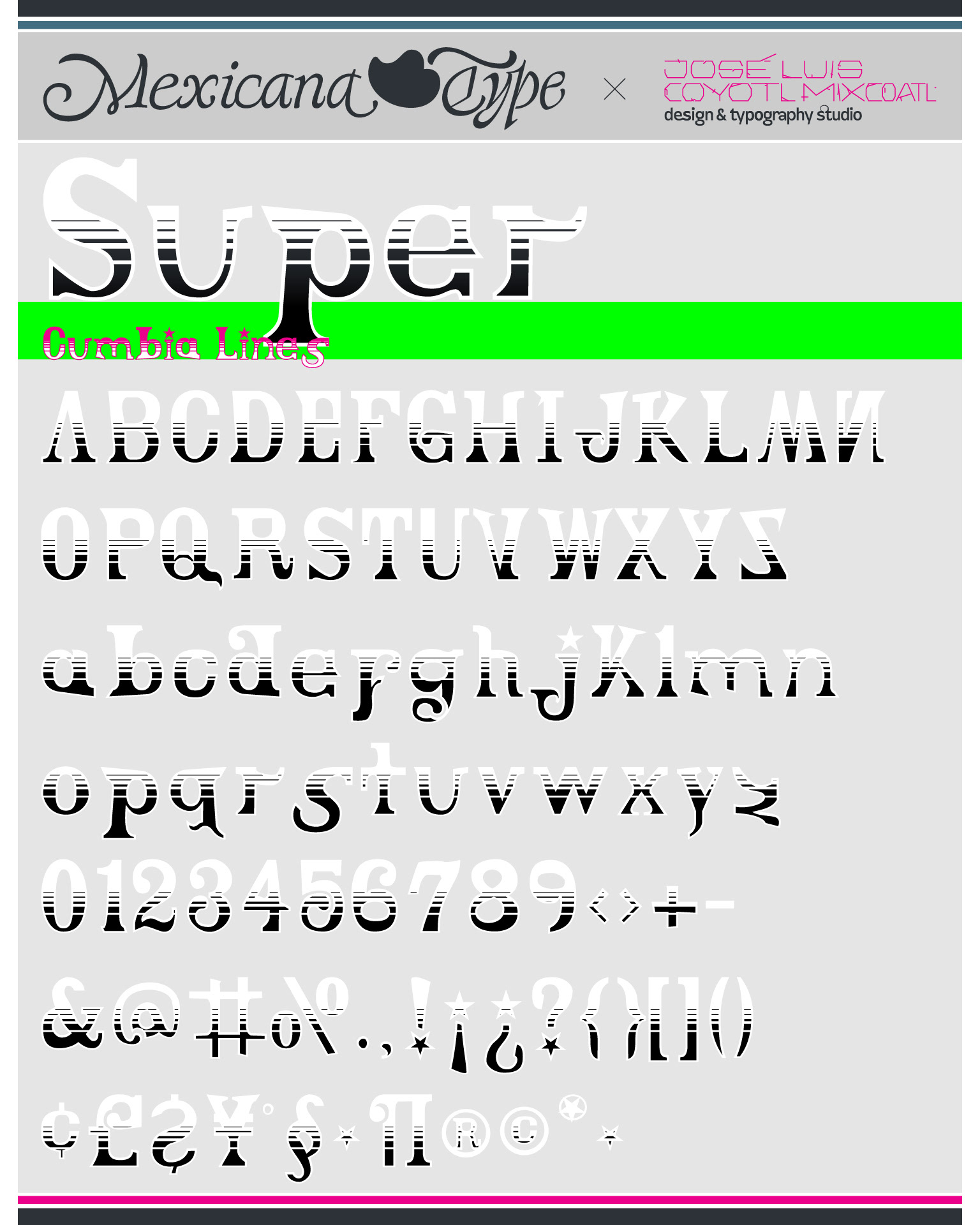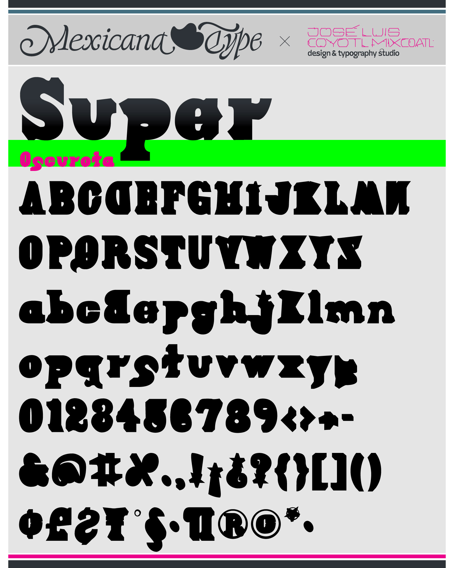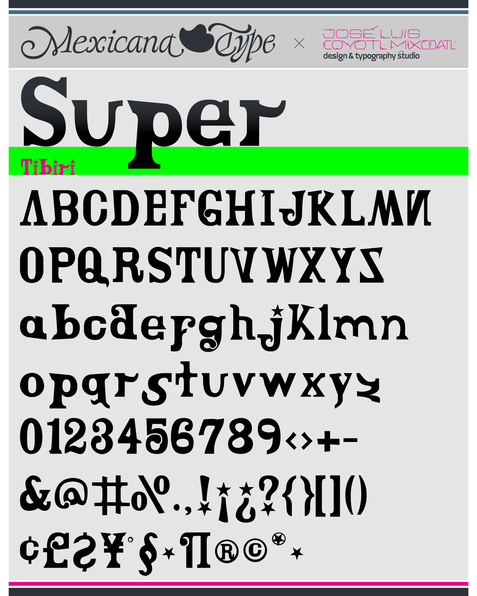 MxT Super es una familia de tipografías influenciadas por las pintas y rótulos del Centro y Sur de México principalmente. Diseñadas con espíritu vernáculo y haciendo referencia al superlativo recurrente para resaltar los nombre y giros comerciales de negocios en zonas populares como: Superpollería Juanita o Super Ofertas, son ejemplos de ello. Super es el resultado de varias combinaciones y estilos de trazo de las letras de rótulo, que combinan o emulan letras existentes, asi como efectos y perspectivas raras y torcidas de las letras de barda, a logotipos de sonidero, letras mochas de imprenta, impresiones imperfectas de carteles para bailes populares, de lucha libre y box, de peregrinaciones y ferias locales, y que combinan trazos sugerentes a la improvisación, lo que en si le da la gracia y estilo muy particulares. Cada una de las variantes tiene un sabor que se diferencía y/o complementa con otros pesos y variantes. Con cuatro variantes que son muy singulares: MxT Super Rotulista, MxT Super Tíbiri, MxT Super Surtidita, MxT Super Oscurota, las últimas dos se pueden usar sobreponiendo una sobre otra para tener un manejo independiente sobre todo en el manejo de color, que se complementan y registran como está en MxT Super Rotulista. Hay dos variantes adicionales que son variantes decorativas: MxT Super Cumbia Lines, que está hecha para poder registrarse sobre MxT Super Tíbiri en un degradado de líneas que también puede funcionar como capa de color; y MxT Super Energy Lines, que sirve para registrar líneas degradadas en tres variantes como son MxT Super Rotulista, MxT Super Surtidita y MxT Super Oscurota, también pudiendo ser utilizada como capa de color.