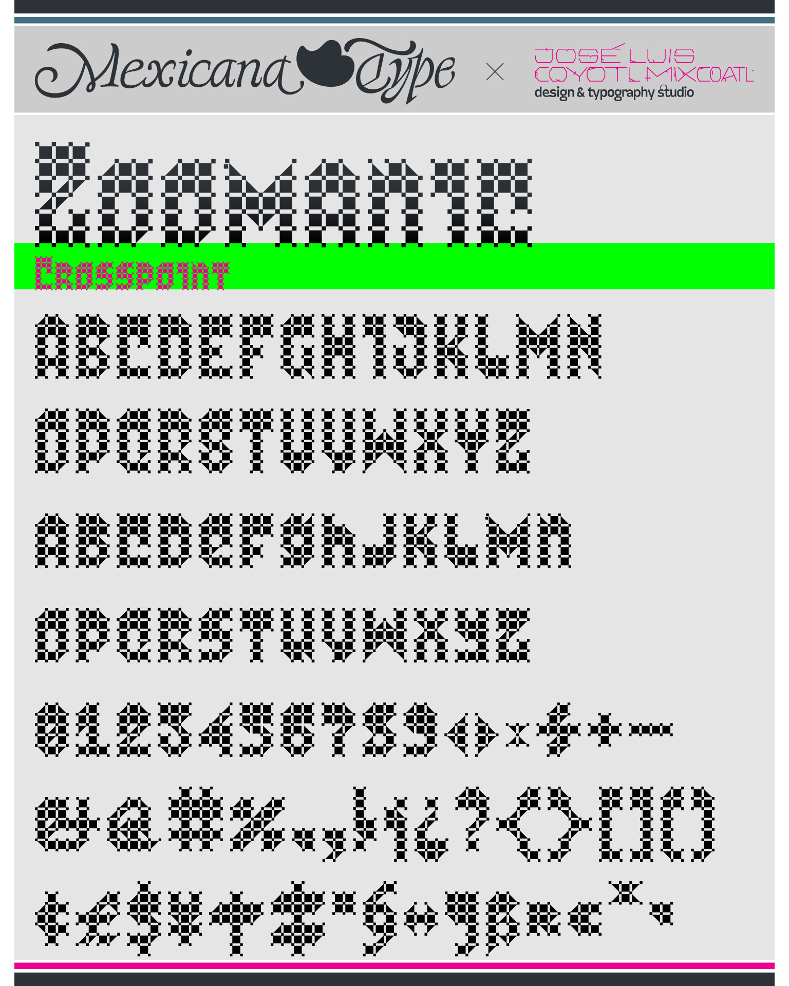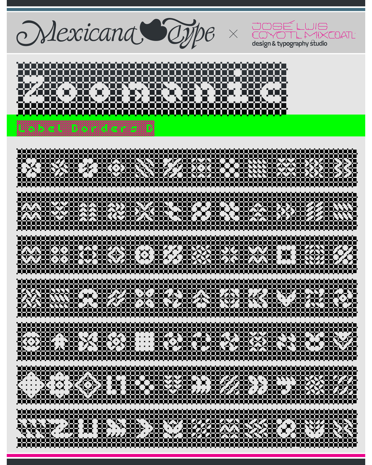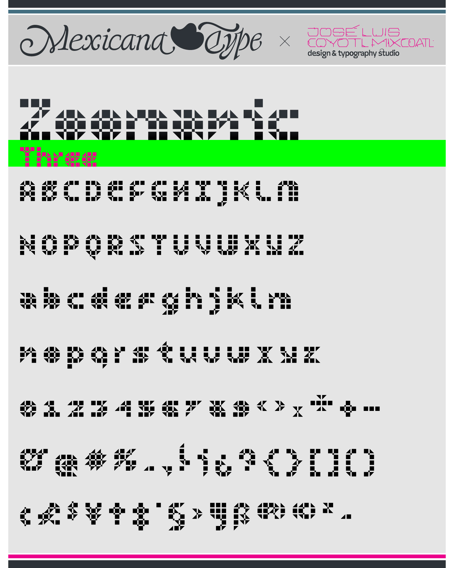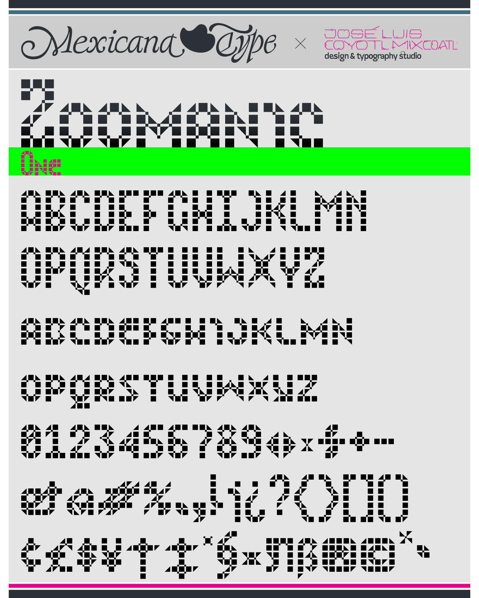 MxT Zoomanic es una super familia de fuentes tipográficas de las que inicialmente se diseñaron sólo una serie de dingbats para un proyecto especial, pero de manera natural se fueron diseñando algunos caracteres hasta que se tuvieron variantes suficientes para decidir completar sus mapas de caracteres, y progresivamente se fueron diseñando más pesos y variantes haciéndola muy amplia y versátil para combinarse entre si. Partiendo del reto de que se estaba diseñando con tres módulos básicos (Dos cuadrados y un triangulo), se lograron hacer combinaciones tanto hermanas como muy diferentes una de otras, y que por si mismas se volvieron en un juego de mexclas excentricas, lo que permitió experimentar no solo con variantes alfabéticas, sino también con los iniciales dingbats y también otras más para bordes y patronajes con un total de 15 variantes. Si bien no son del todo aptas para lecturas largas y fáciles, si tienen un juego gráfico muy interesante, además de que genera una textura y que le dan unas particularidades únicas.