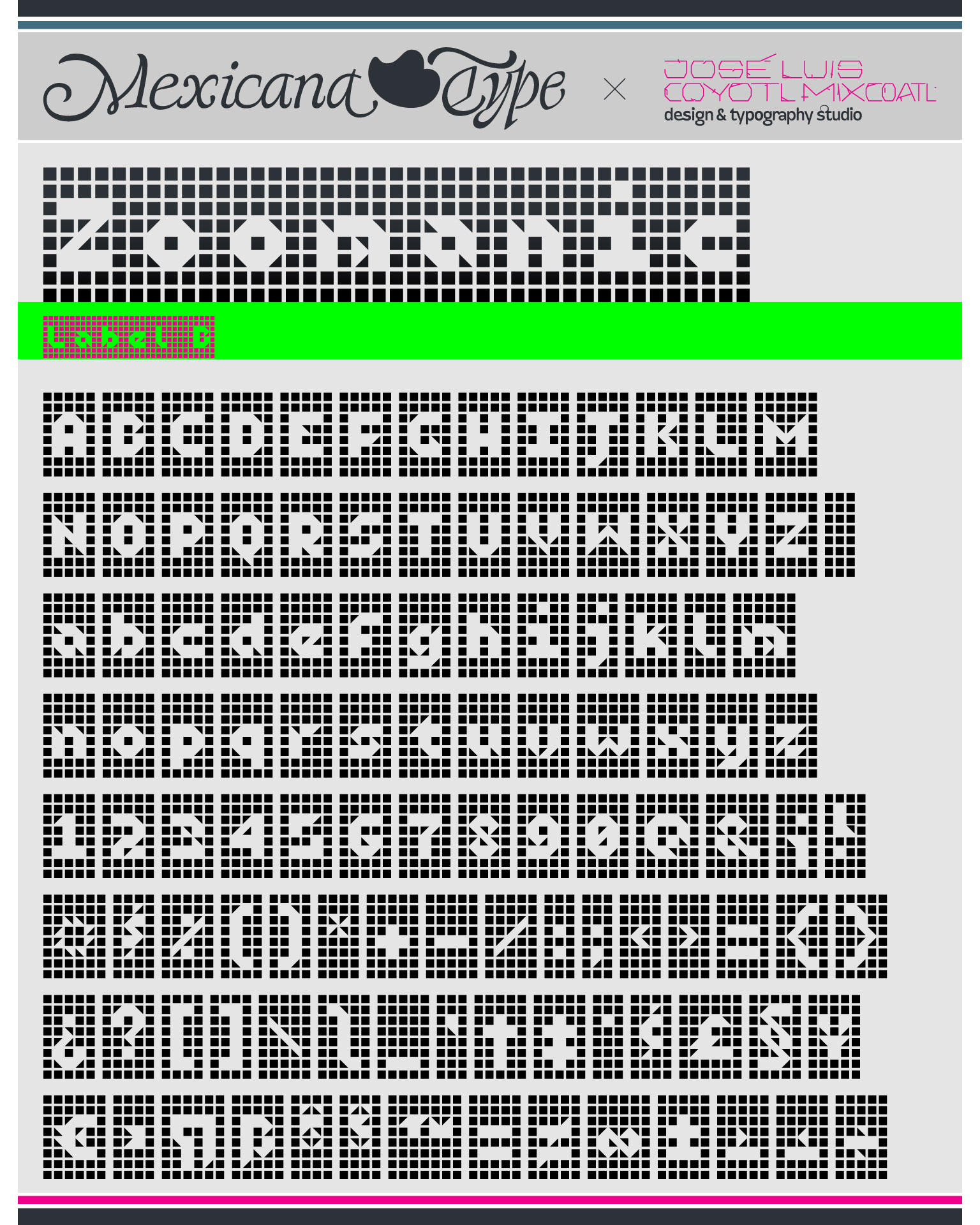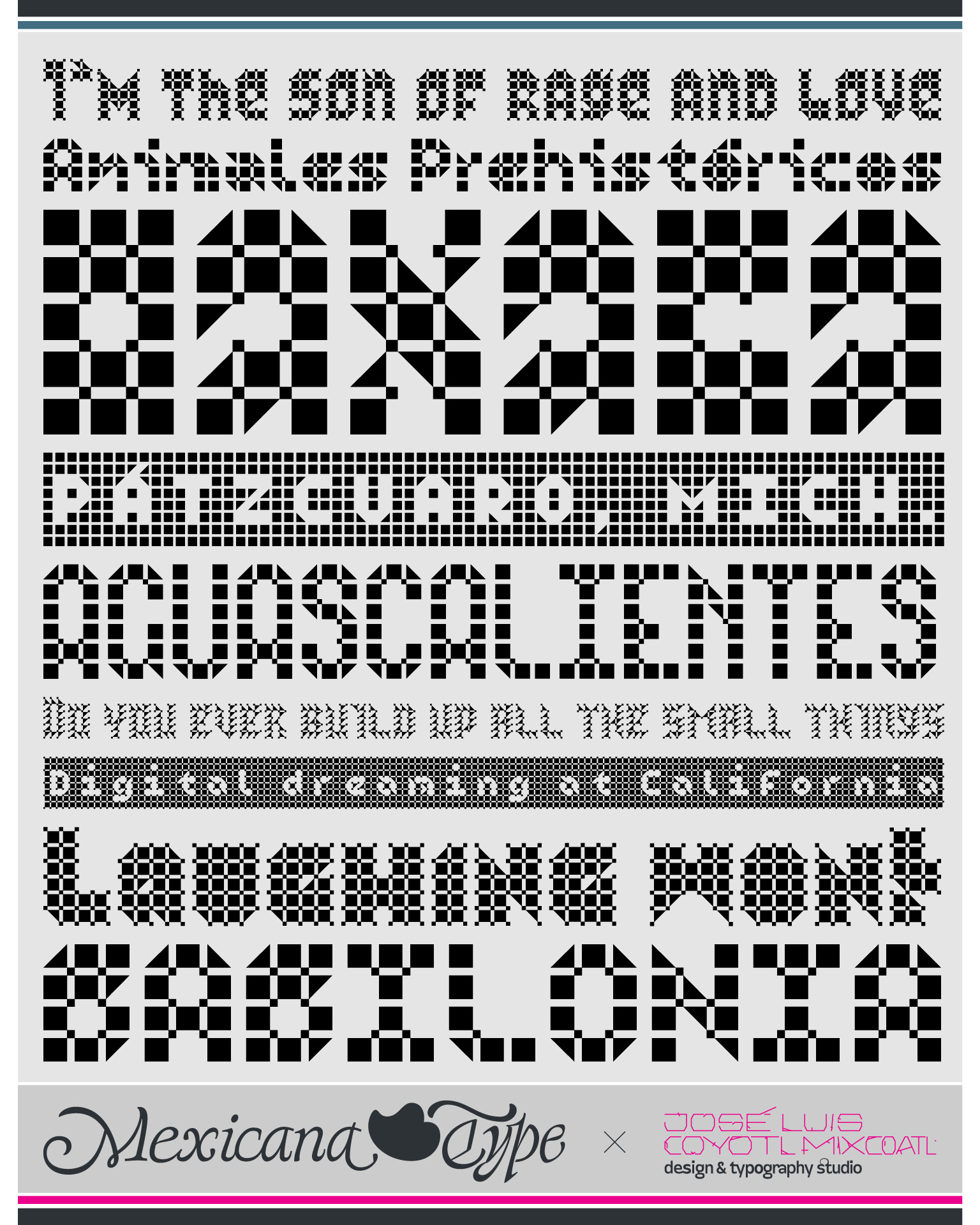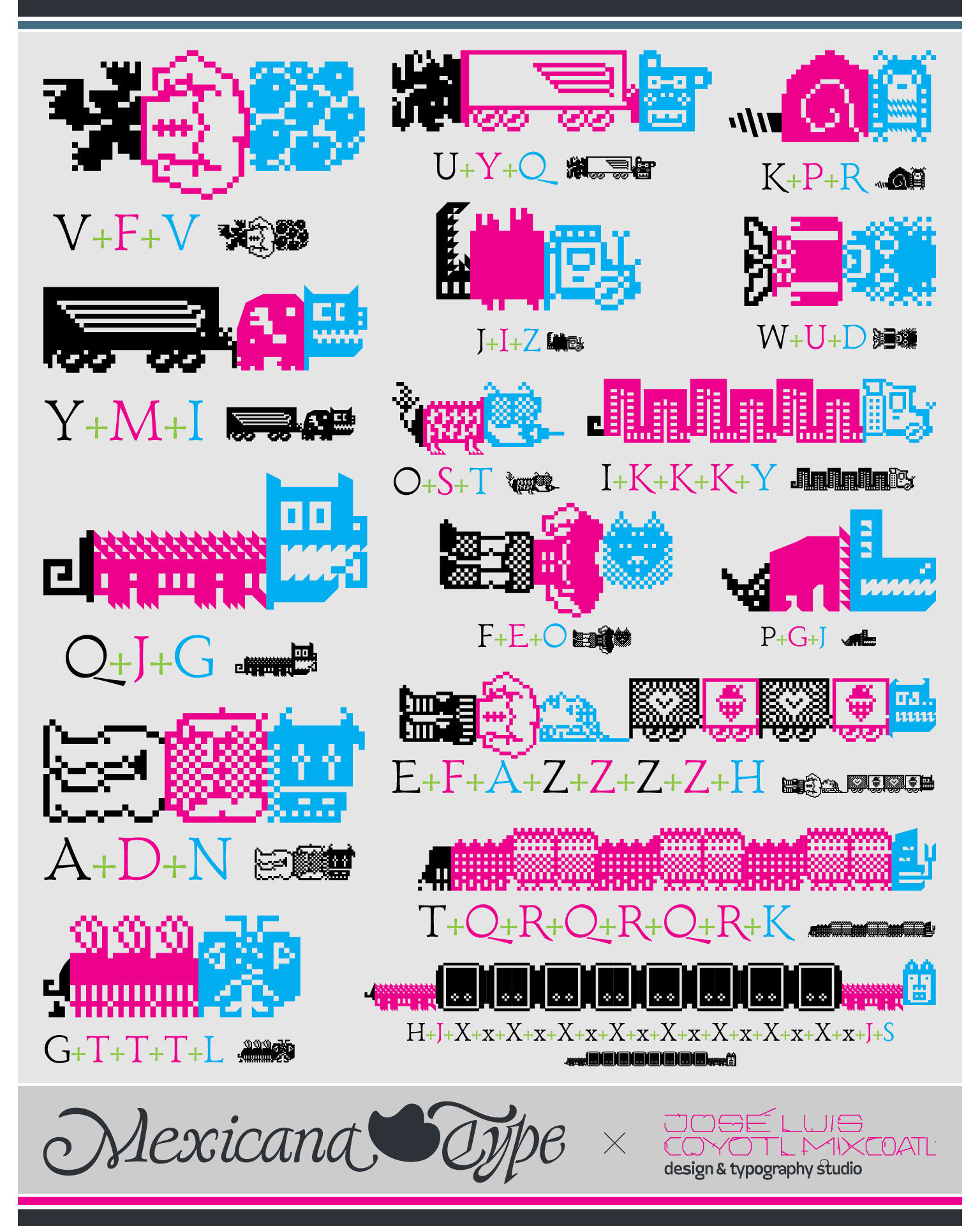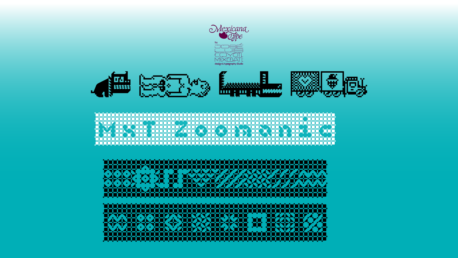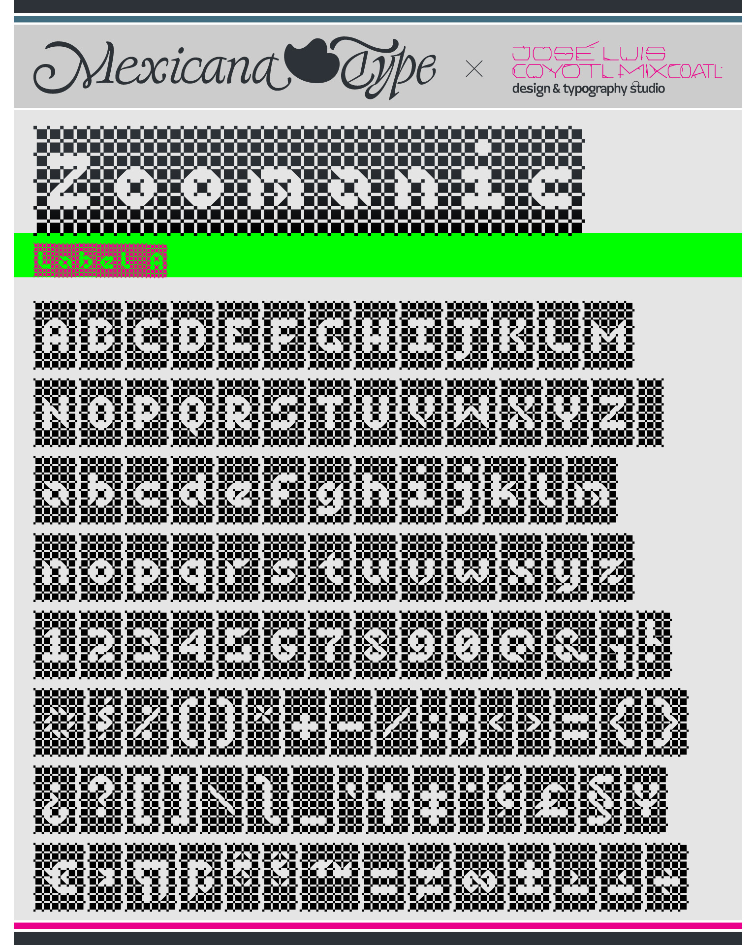 MxT Zoomanic es una super familia de fuentes tipográficas de las que inicialmente se diseñaron sólo una serie de dingbats para un proyecto especial, pero de manera natural se fueron diseñando algunos caracteres hasta que se tuvieron variantes suficientes para decidir completar sus mapas de caracteres, y progresivamente se fueron diseñando más pesos y variantes haciéndola muy amplia y versátil para combinarse entre si. Partiendo del reto de que se estaba diseñando con tres módulos básicos (Dos cuadrados y un triangulo), se lograron hacer combinaciones tanto hermanas como muy diferentes una de otras, y que por si mismas se volvieron en un juego de mexclas excentricas, lo que permitió experimentar no solo con variantes alfabéticas, sino también con los iniciales dingbats y también otras más para bordes y patronajes con un total de 15 variantes. Si bien no son del todo aptas para lecturas largas y fáciles, si tienen un juego gráfico muy interesante, además de que genera una textura y que le dan unas particularidades únicas.