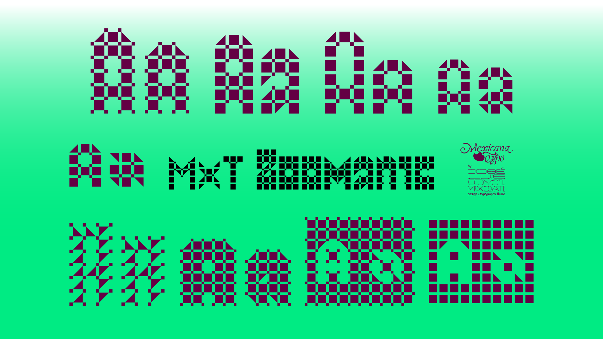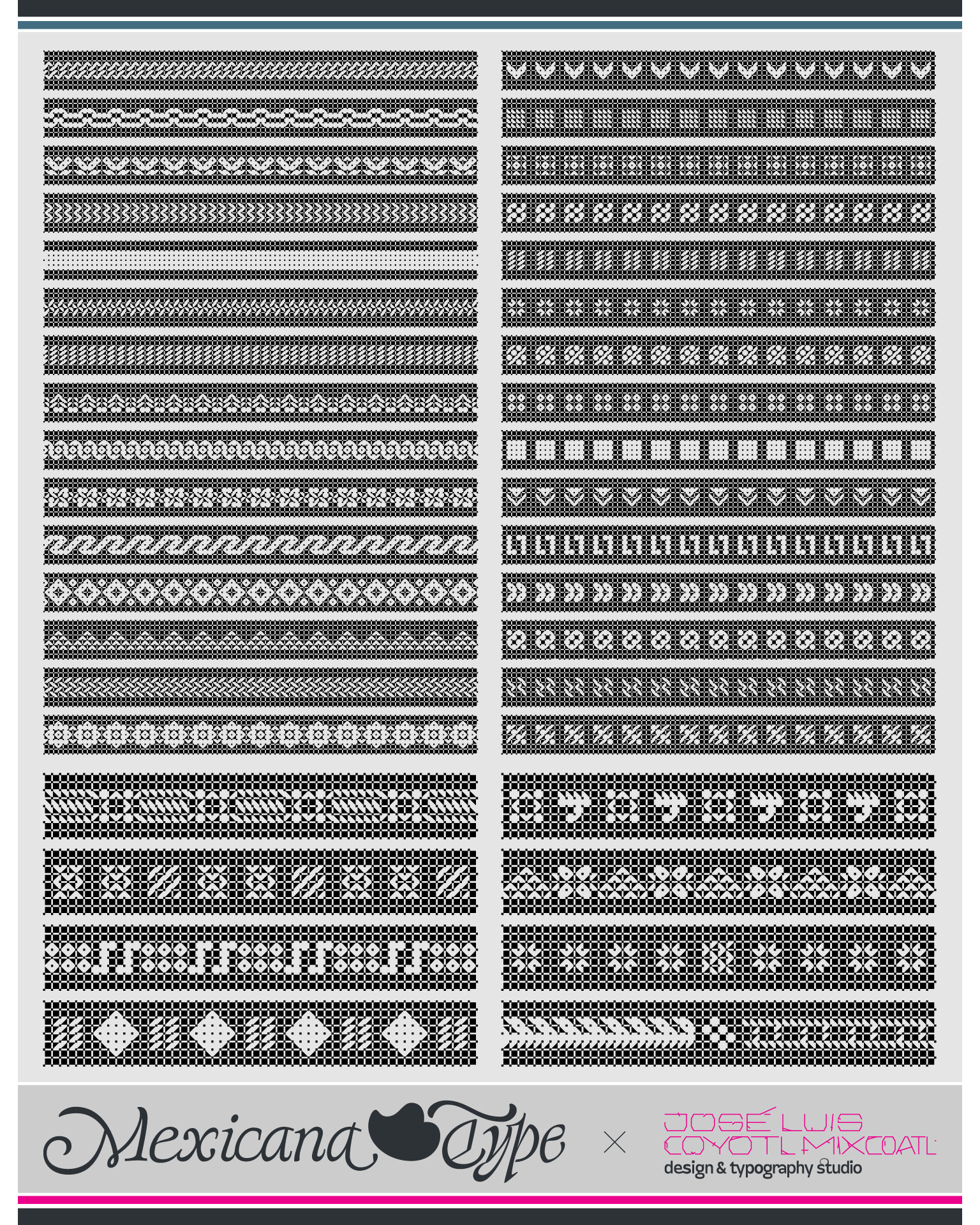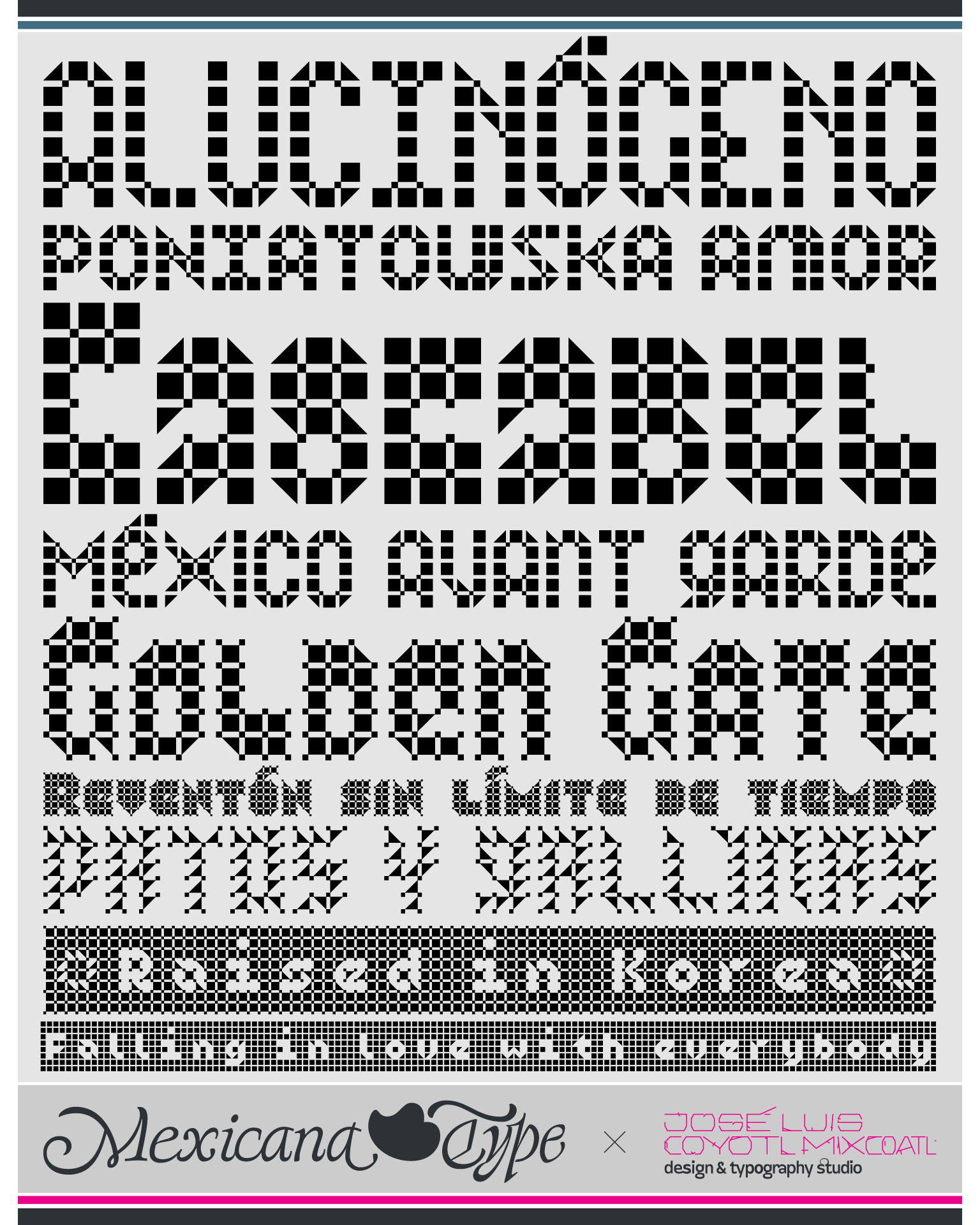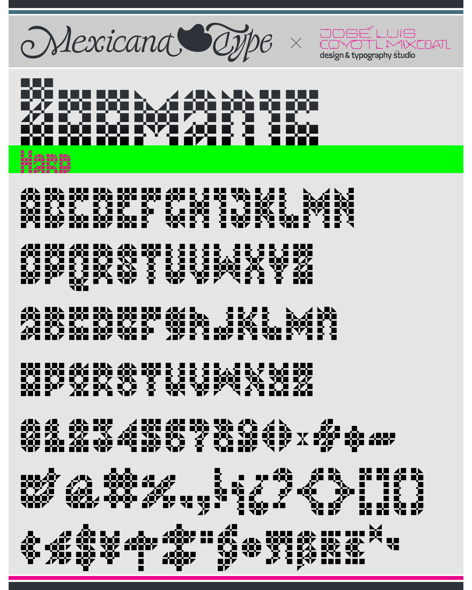 MxT Zoomanic es una super familia de fuentes tipográficas de las que inicialmente se diseñaron sólo una serie de dingbats para un proyecto especial, pero de manera natural se fueron diseñando algunos caracteres hasta que se tuvieron variantes suficientes para decidir completar sus mapas de caracteres, y progresivamente se fueron diseñando más pesos y variantes haciéndola muy amplia y versátil para combinarse entre si. Partiendo del reto de que se estaba diseñando con tres módulos básicos (Dos cuadrados y un triangulo), se lograron hacer combinaciones tanto hermanas como muy diferentes una de otras, y que por si mismas se volvieron en un juego de mexclas excentricas, lo que permitió experimentar no solo con variantes alfabéticas, sino también con los iniciales dingbats y también otras más para bordes y patronajes con un total de 15 variantes. Si bien no son del todo aptas para lecturas largas y fáciles, si tienen un juego gráfico muy interesante, además de que genera una textura y que le dan unas particularidades únicas.